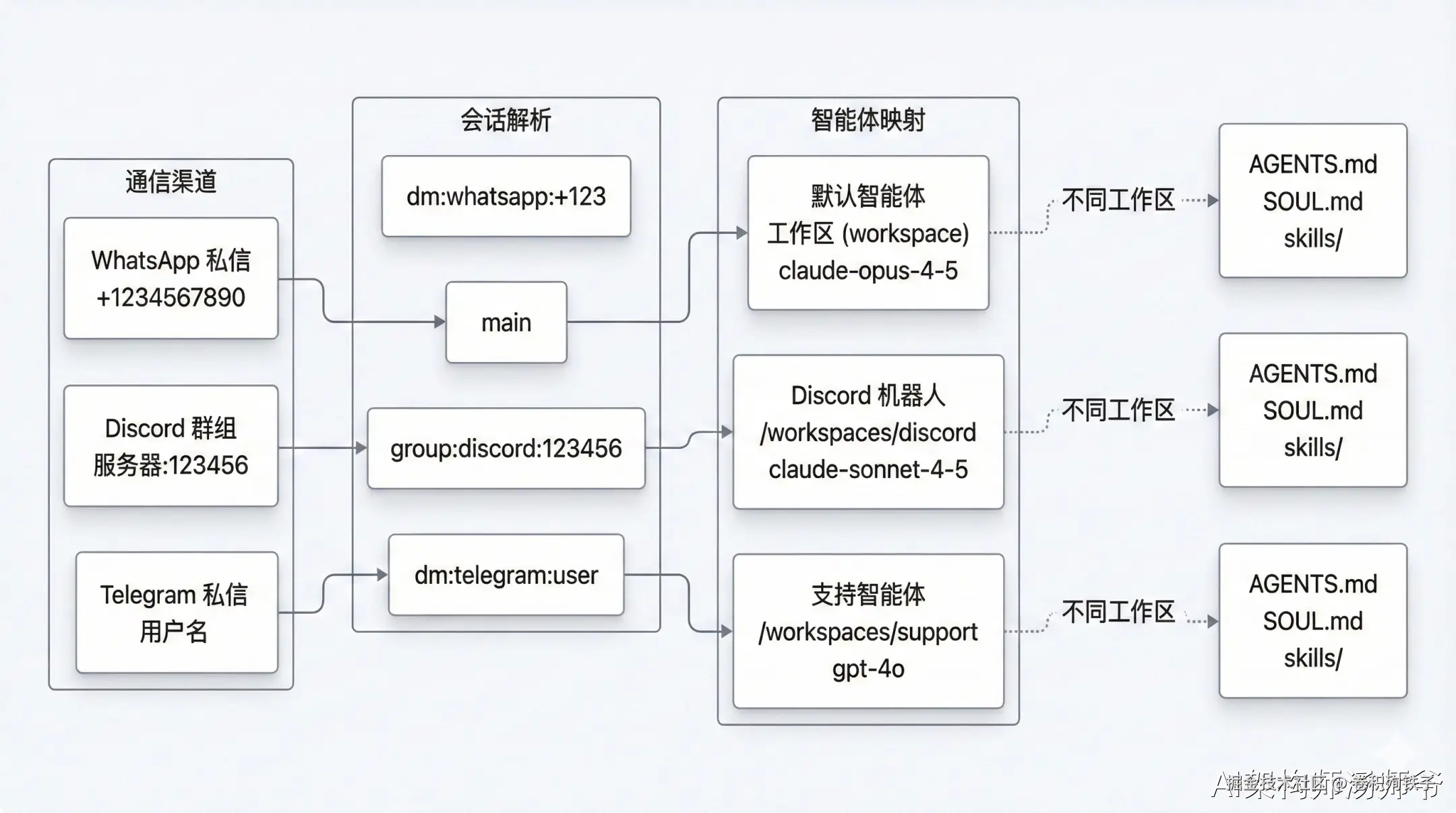 网关就像一个快递分拣中心,所有包裹(消息)进来后,由它检查收件人信息、分配到正确的分拣线(Agent),最后把回复发出去。