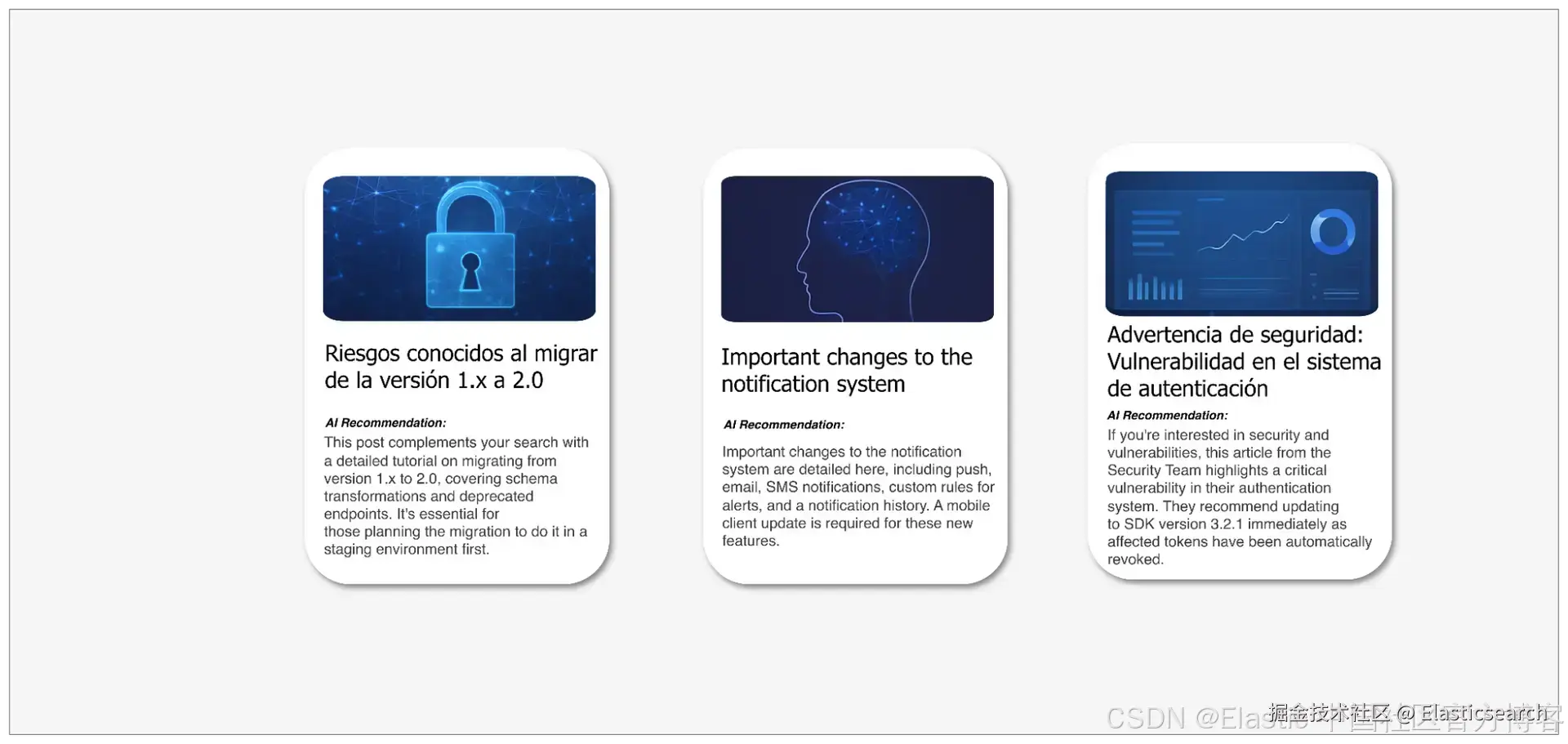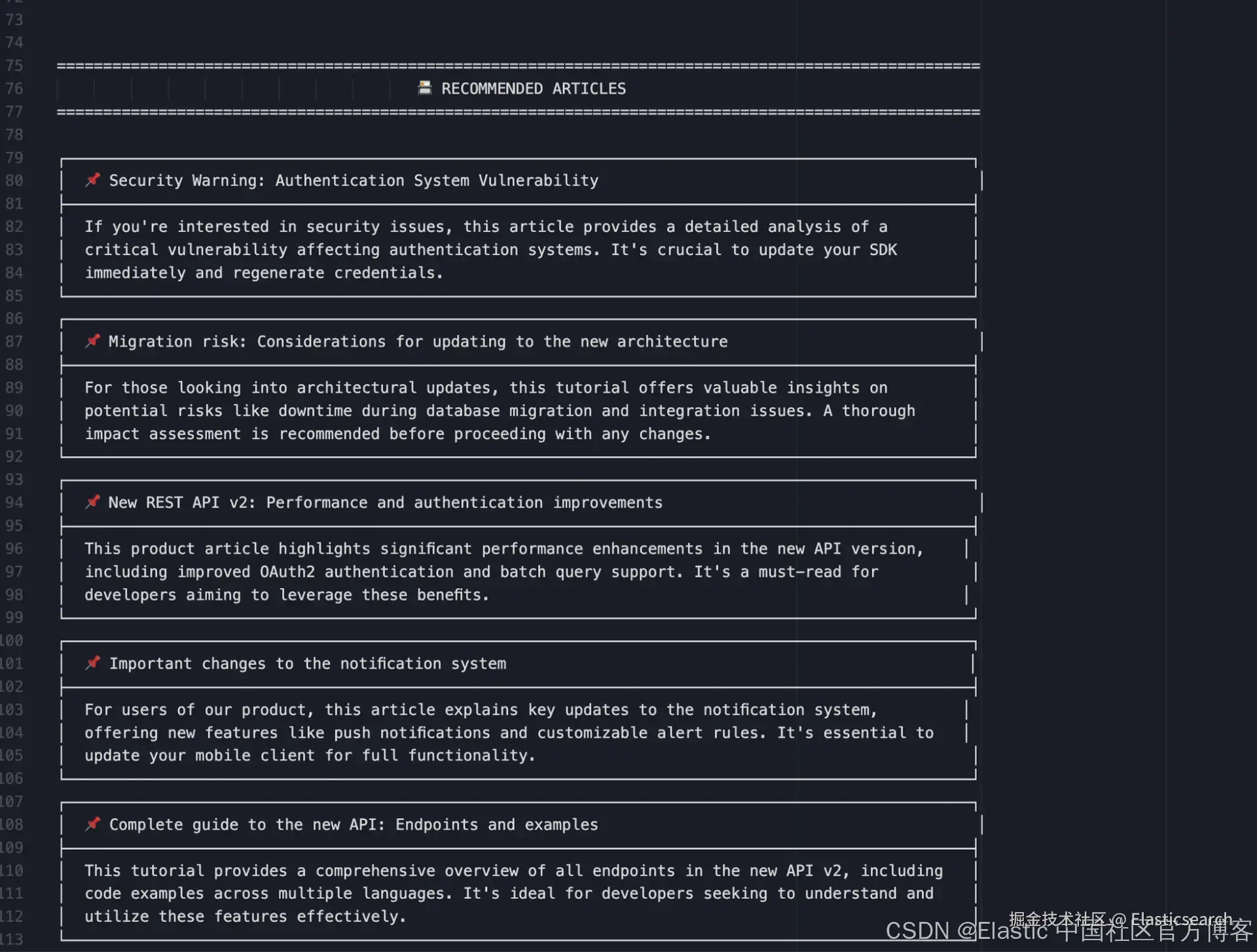 我们查询的主题是:“Security and vulnerabilities。” 这个问题作为搜索查询,用于检索存储在 Elasticsearch 中的文档。检索到的结果随后传递给模型,模型根据其内容生成推荐。如我们所见,模型在生成吸引人的短文本方面表现出色,能够激发读者点击的兴趣。