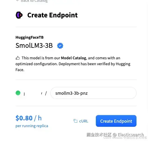 如 Elasticsearch Hugging Face inference endpoints 文档所述,文本生成需要与 OpenAI API 兼容的模型。因此,我们需要在 Hugging Face endpoint URL 后追加 /v1/chat/completions 子路径。最终结果将如下所示: