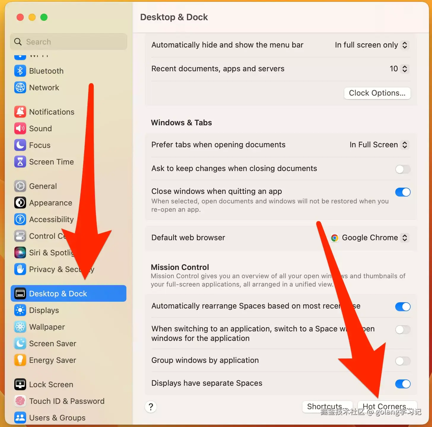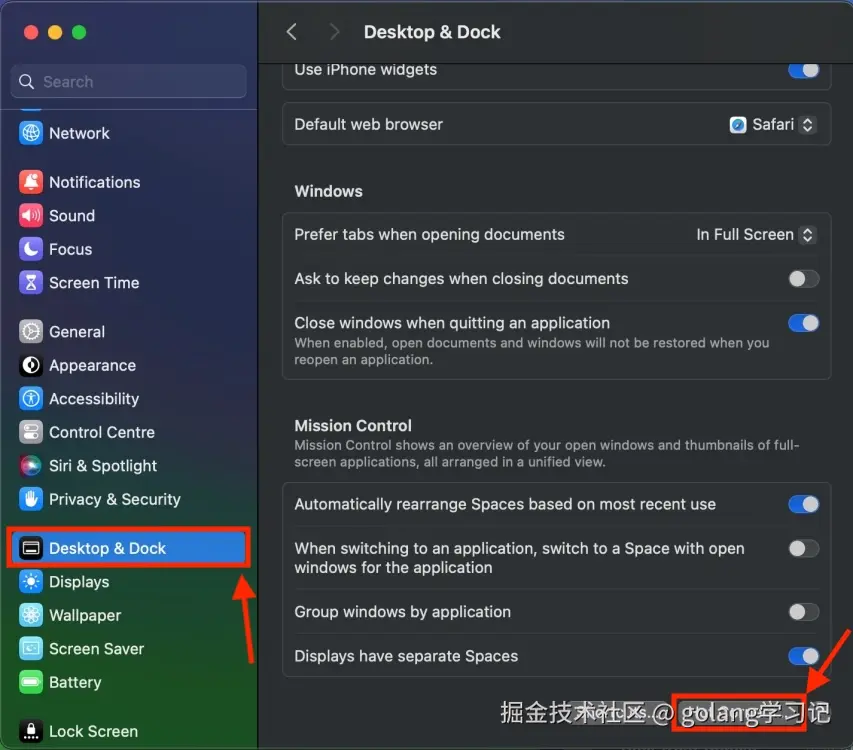 在左侧边栏中,点击 "桌面与 Dock"(Desktop & Dock)