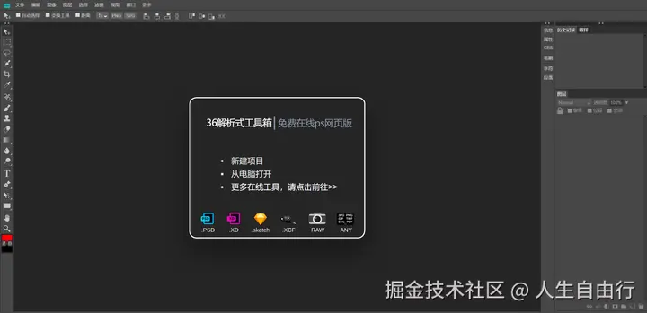 作为天天和图片打交道的打工人,不管是改工作素材、做宣传配图、修证件照,还是临时处理设计文件,图片处理都是日常刚需。之前总被安装包庞大、启动慢的PS客户端折腾得头疼,直到我挖到36解析式工具箱里的在线PS网页版,真心想把这个免费好用的工具分享给大家,实打实帮咱们提升效率,把免费实用进行到底!