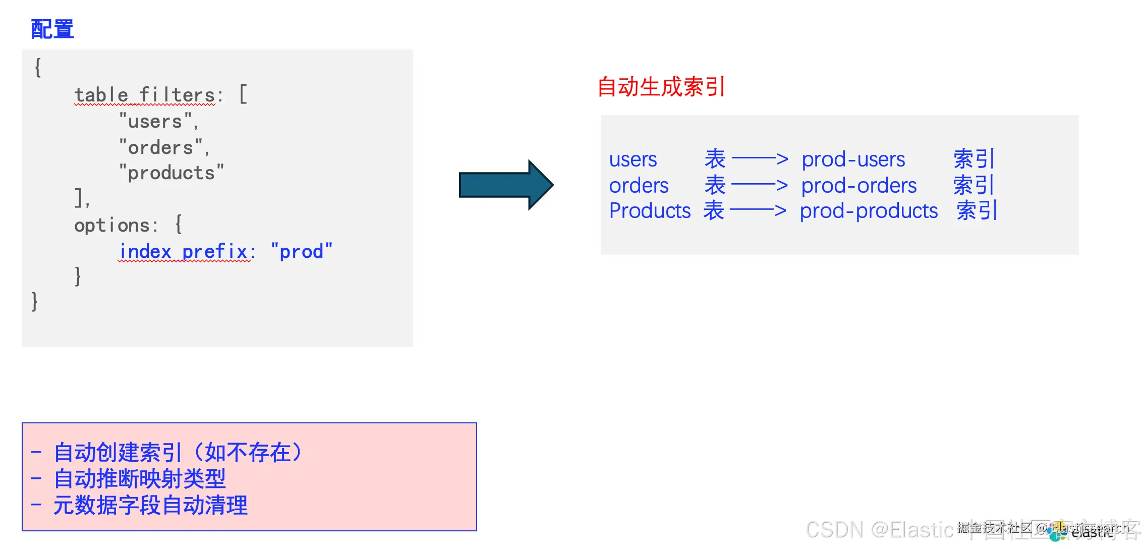ElasticRelay 会从事件里提取表名或集合名,并自动拼接索引前缀生成目标索引。这意味着一个同步链路可以自然地把不同业务实体分发到不同索引中,而不是把所有内容硬塞进一个统一索引。