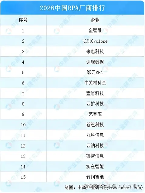 厂商这块的话,详细至于厂商这里就不做太多介绍了,因为到了 2026年,老牌和头部的,依然还是那几家。金智维,艺赛旗,来也等,强者恒强, AI技术的出现并不会使他们没落,反而给 RPA带来了更大的机遇。