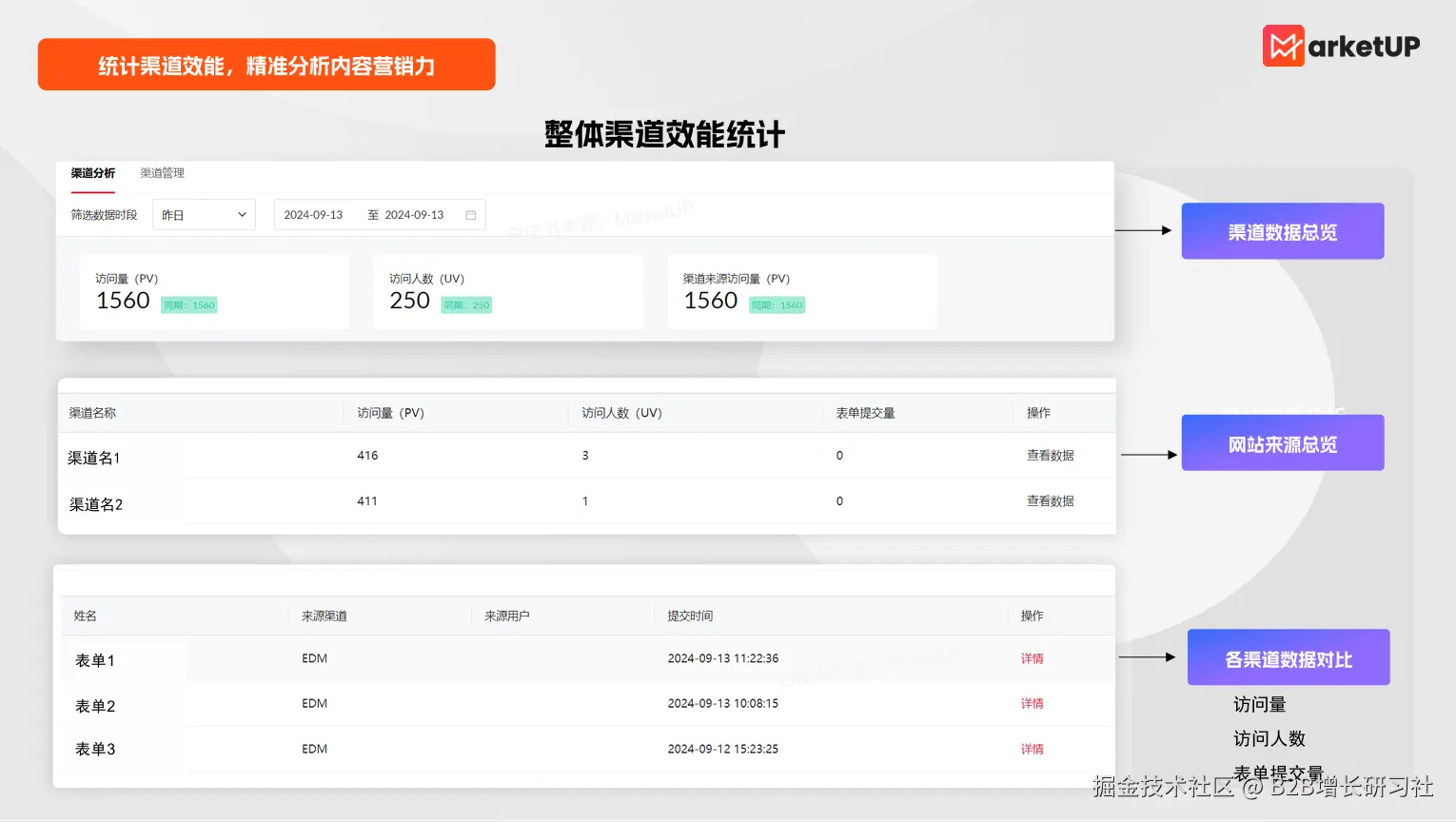 - 全渠道触点接入:无论是营销型官网、微信生态(小程序/公众号),还是线下的会议系统,所有触点的数据必须统一接入贯穿全流程的底层数据平台(如 MarketUP 等)。