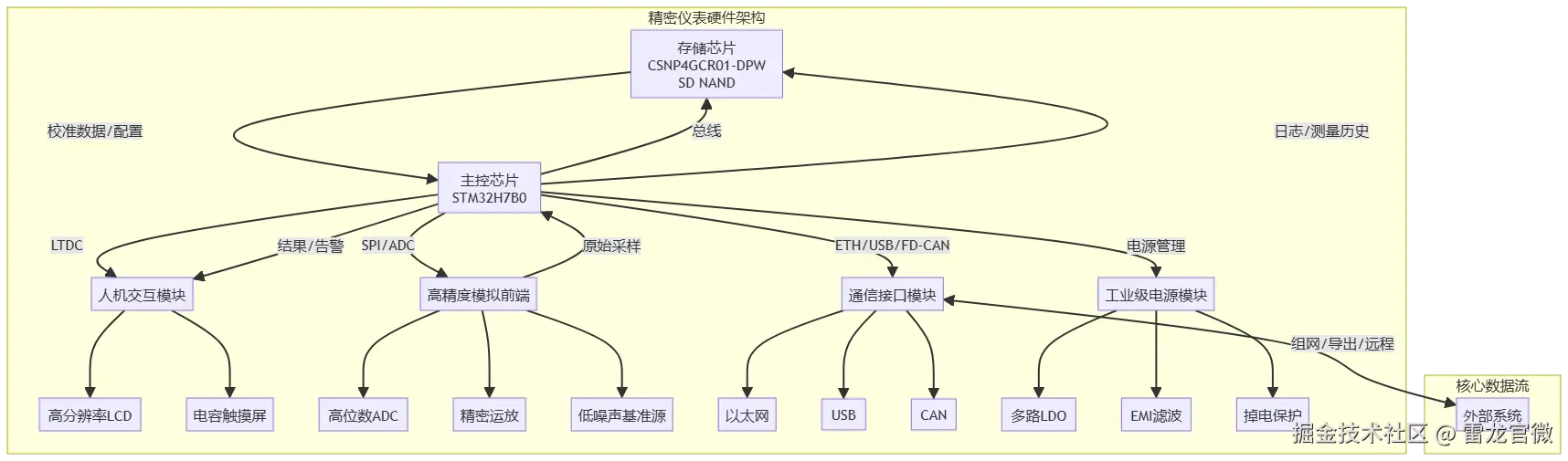 高精度模拟前端:包含高位数的ADC、精密运放和低噪声基准源,是保证测量精度的物理基础。