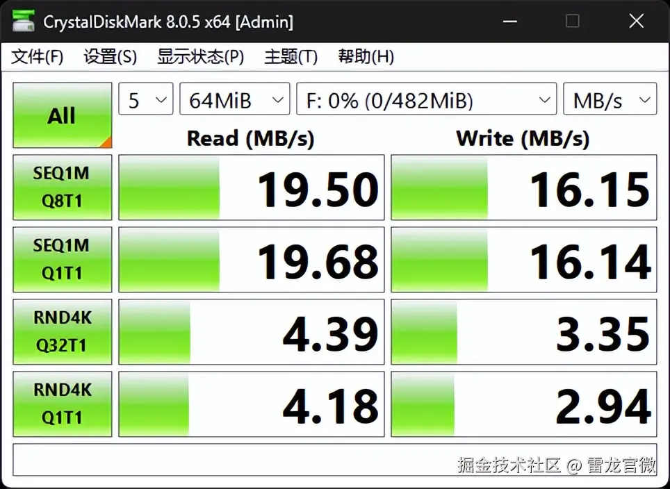 我们使用官方提供的 SD NAND 转接板,通过 USB 3.0 读卡器连接至 PC。采用的 CrystalDiskMark 软件进行读写速度测试,结果如下: