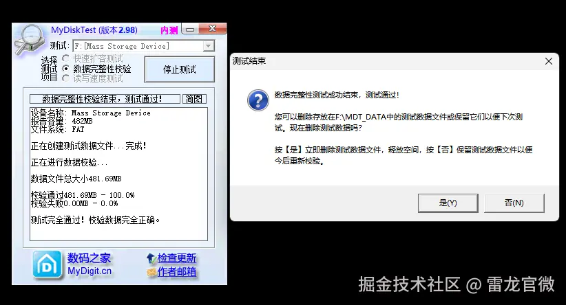 为验证芯片的真实容量和在全盘读写下的数据可靠性,我们使用 MyDiskTest 软件进行了全面的数据完整性校验。