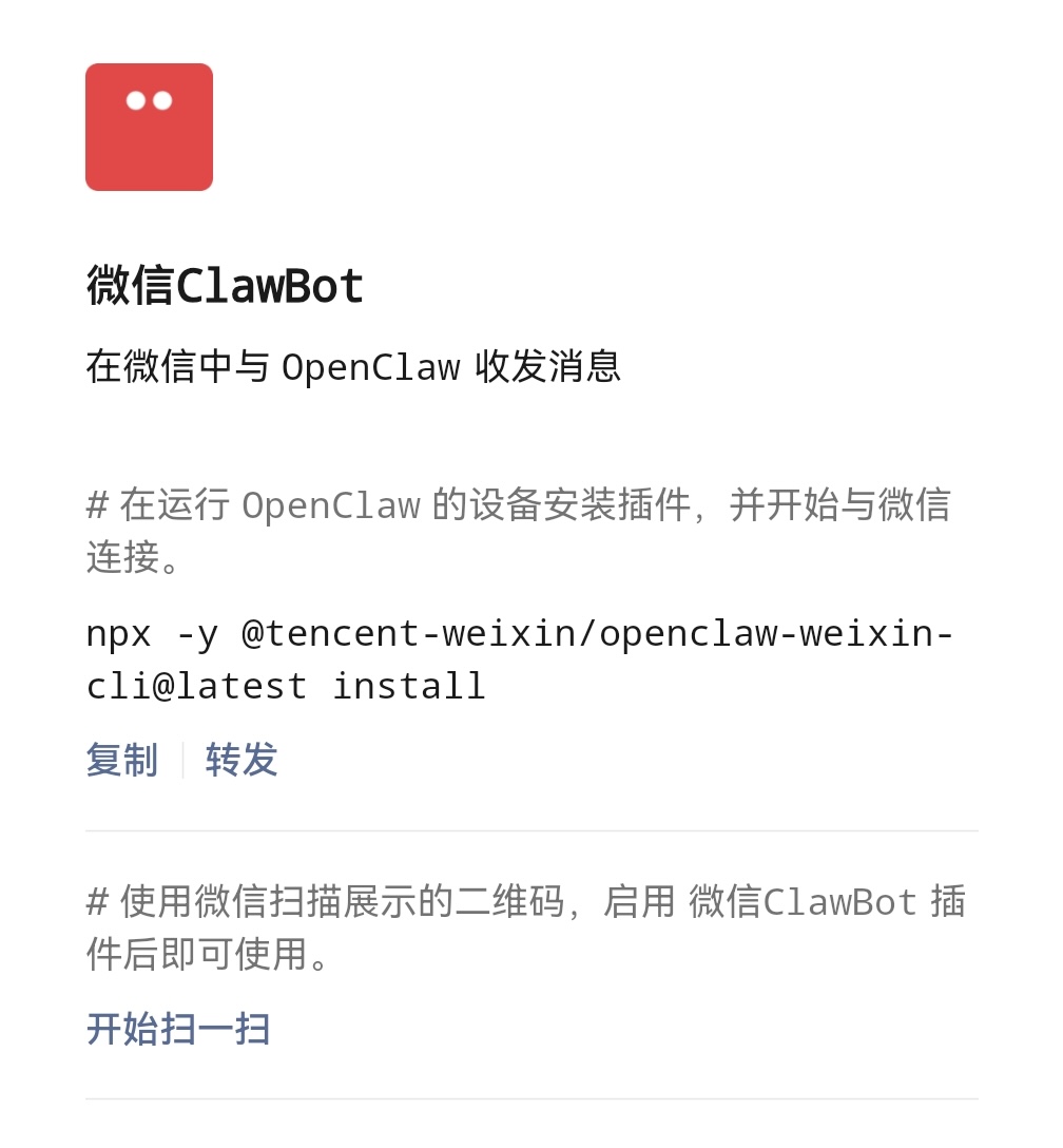 进入插件详情,可以看到官方给出了接入微信 ClawBot 的指引: