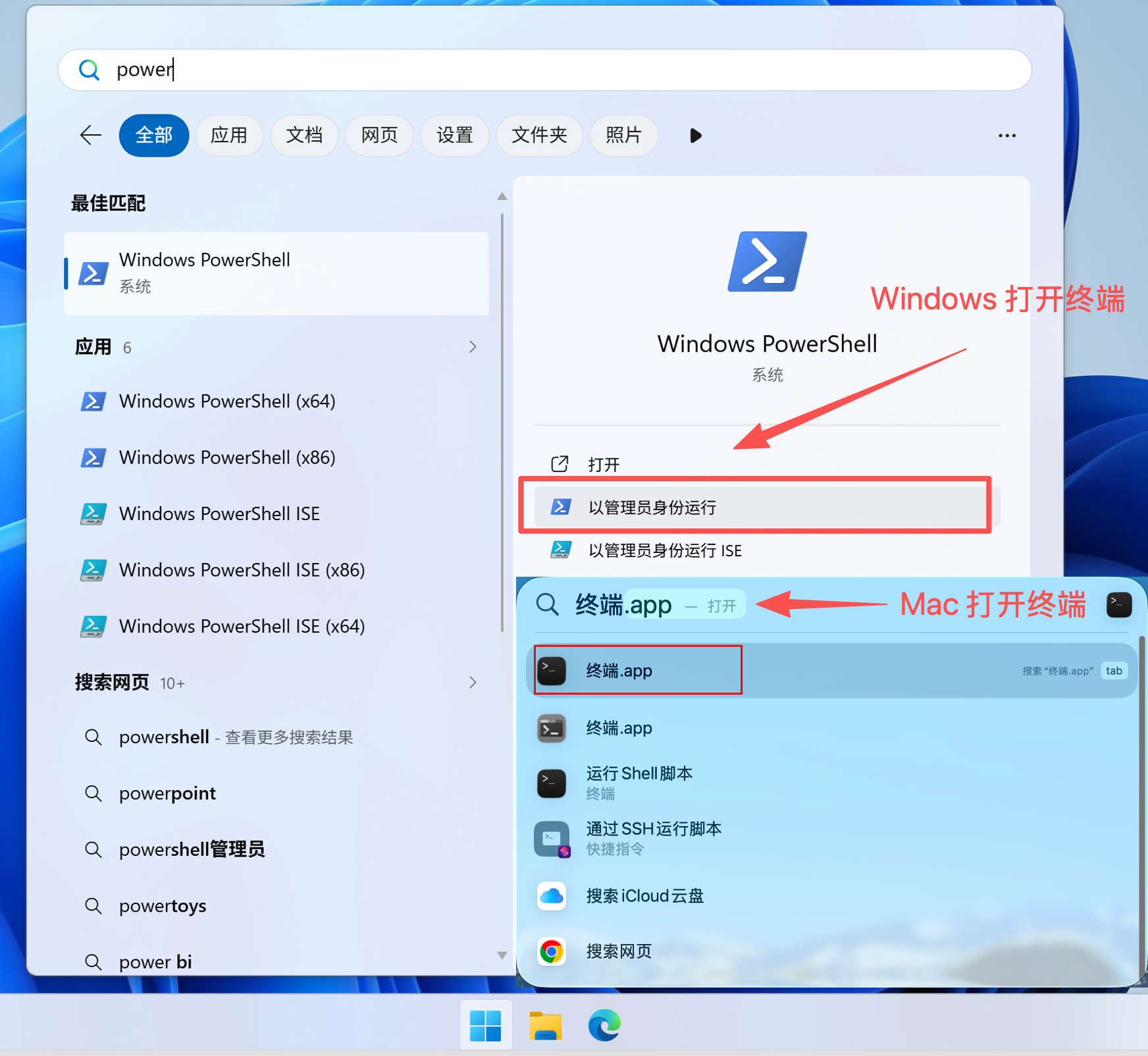 Windows 可以搜索 PowerShell,并 以管理员身份运行;Mac 直接搜索 "终端" 并打开即可: