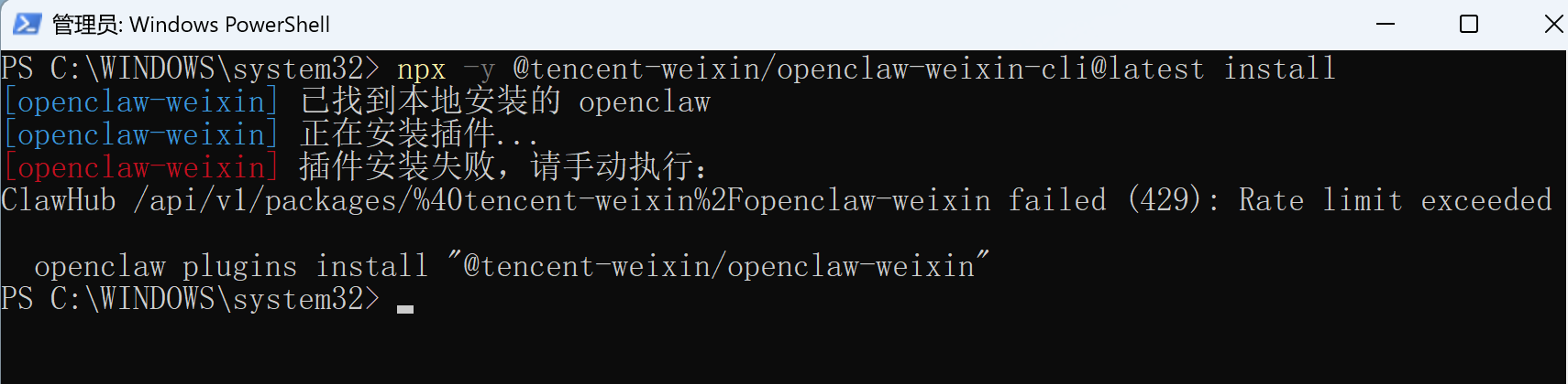 这是因为 OpenClaw 官方插件仓库太火爆了,导致安装时可能会被限流: