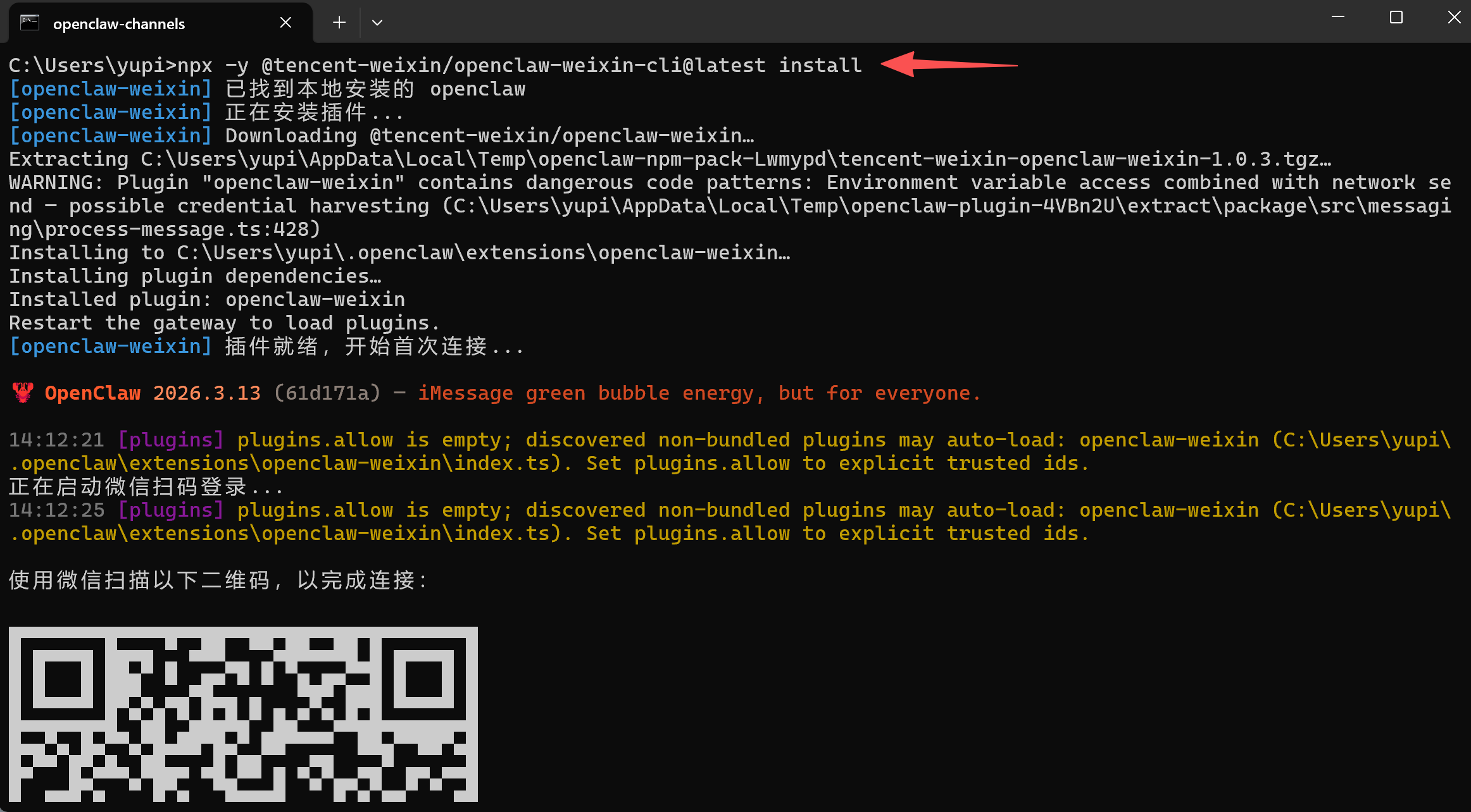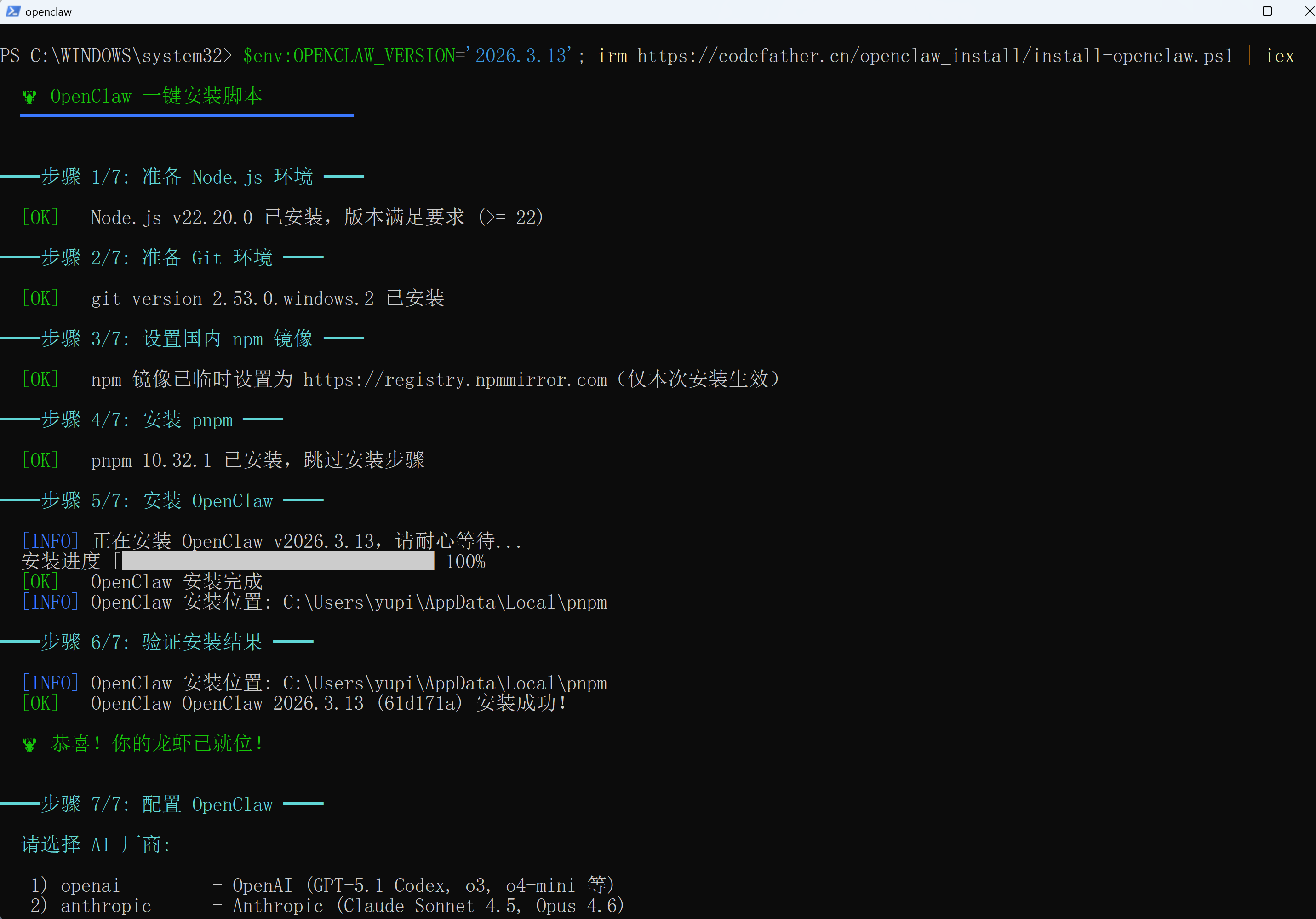 细心的同学会发现,我在命令中添加了版本参数,指定安装 2026.3.13 这个版本。