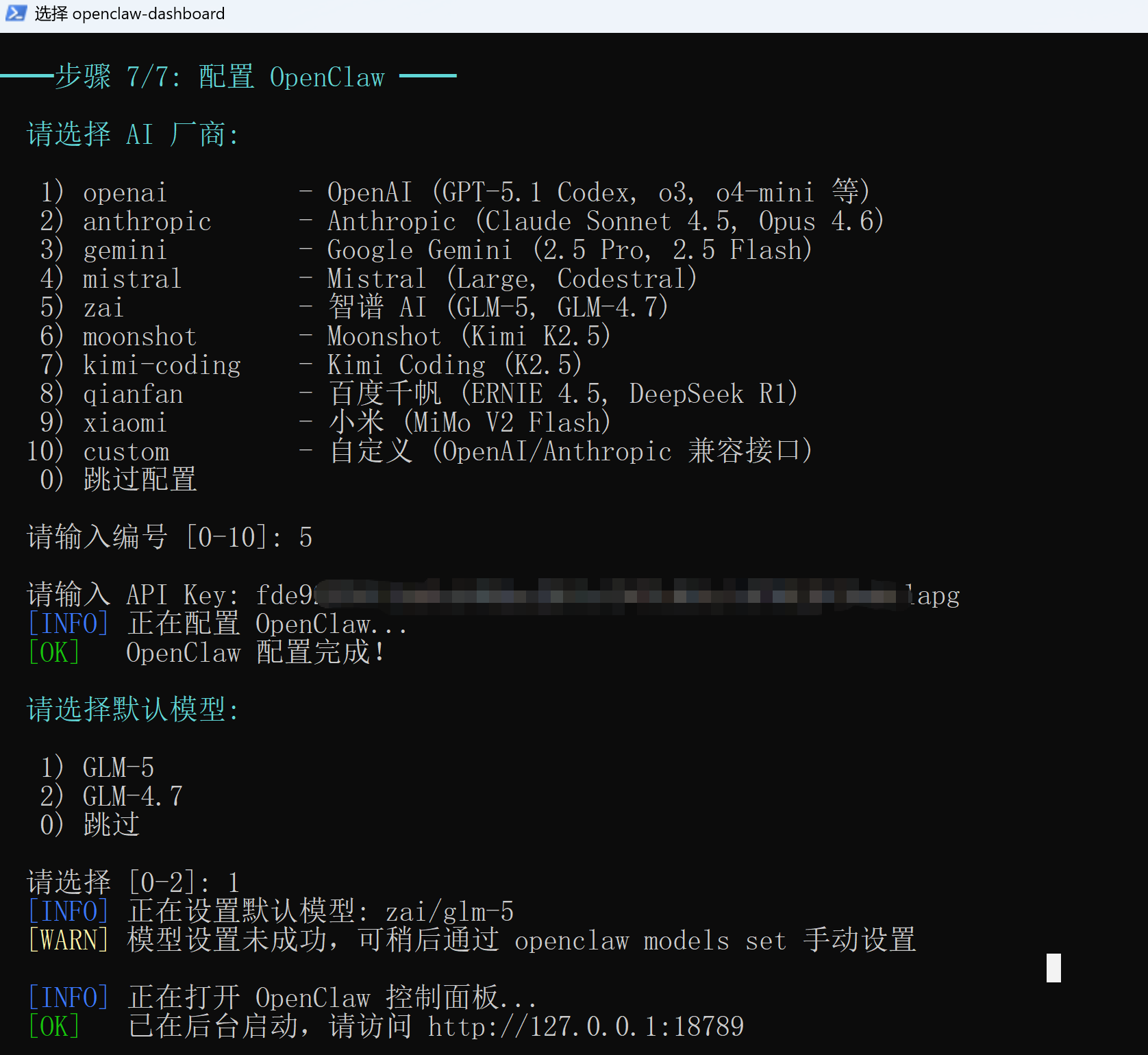 4)安装成功后,会引导你配置 AI 的大模型 API Key 密钥。