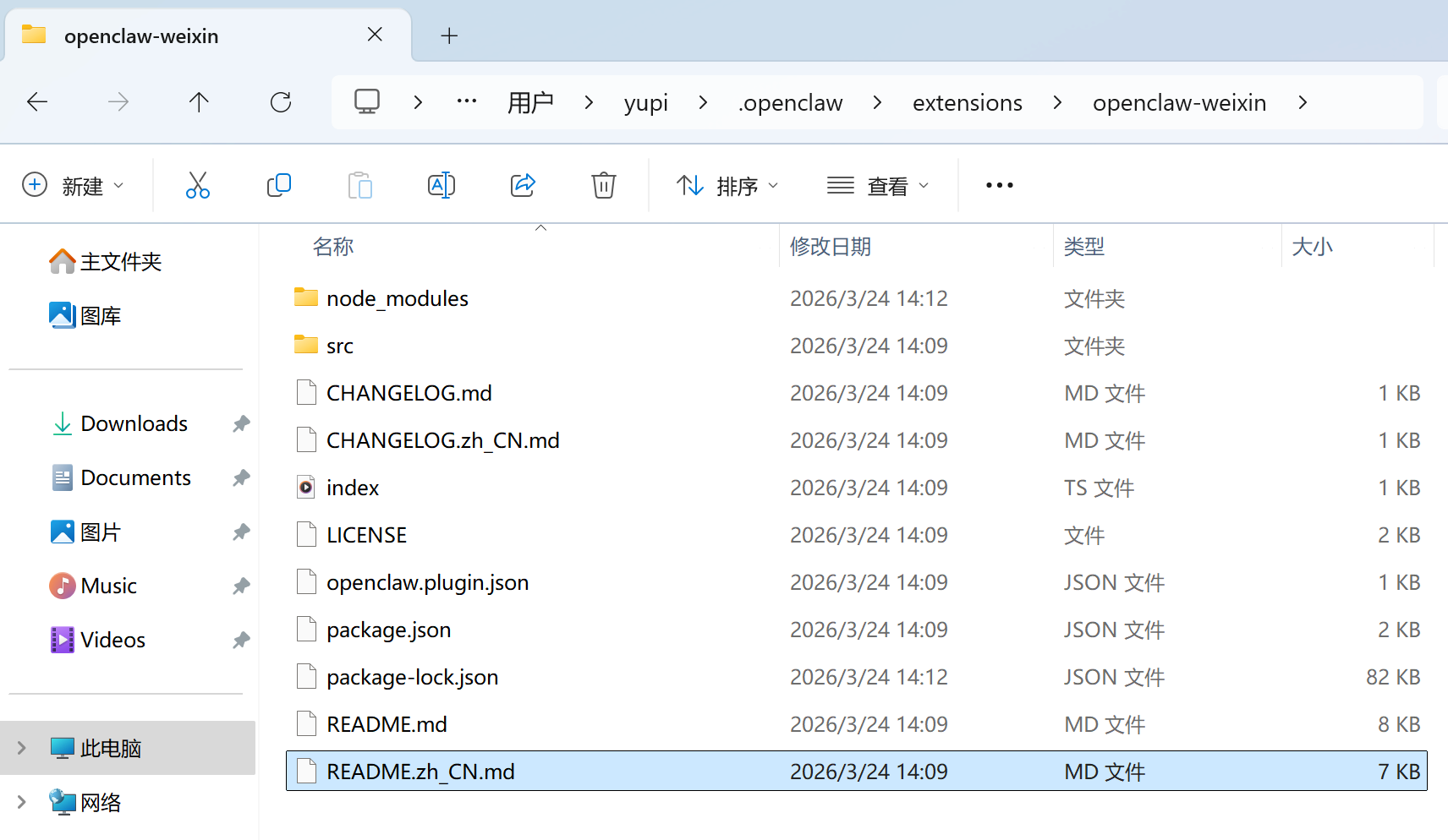 安装完插件后,你可以在 OpenClaw 的插件目录下找到 openclaw-weixin 相关的源码和 README.md 介绍文档,感兴趣的同学可以翻一翻: