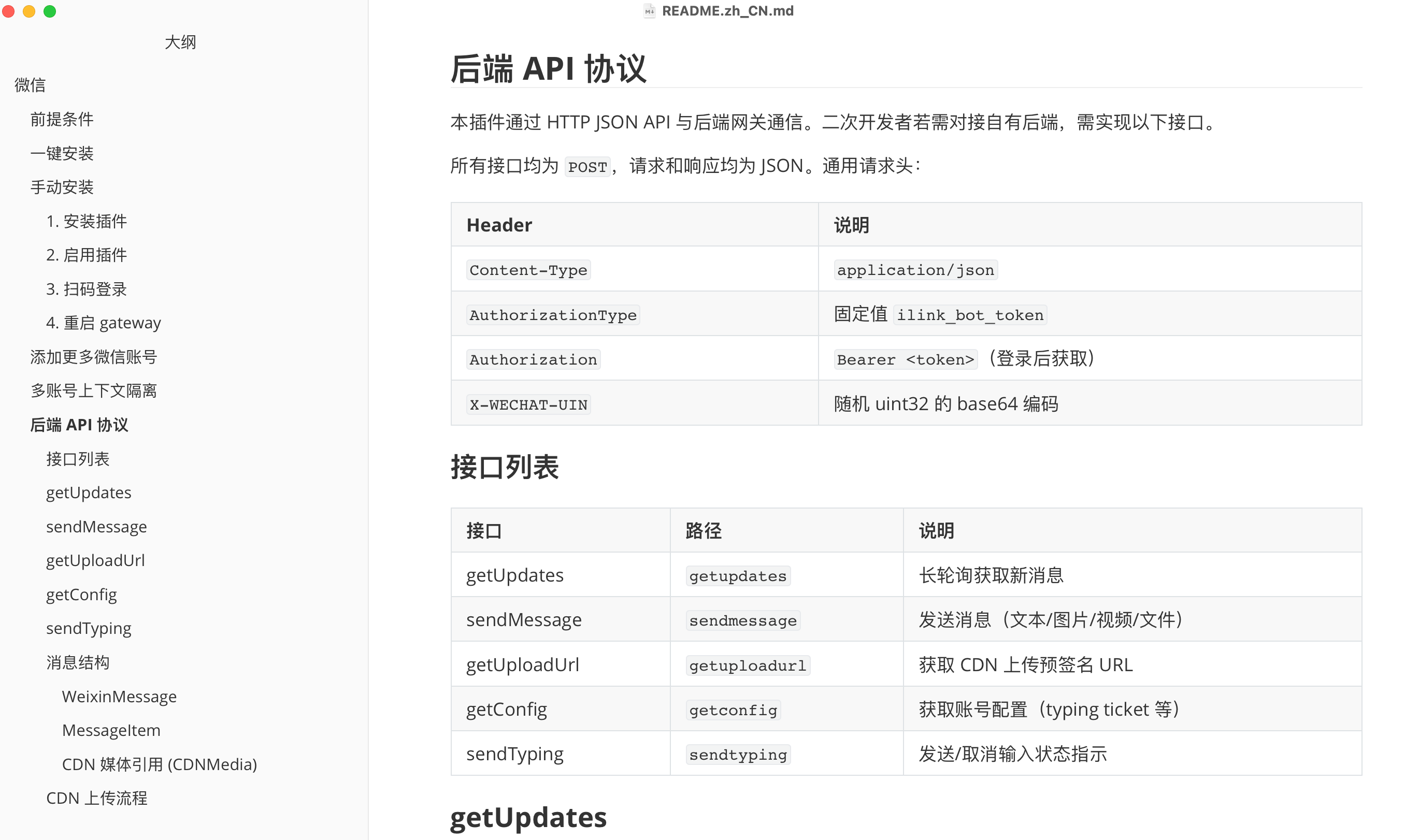 通过阅读这个文档,你可以了解到更多高级用法,比如多账号上下文隔离(让每个微信号的对话记忆互不干扰)、后端 API 协议(方便二次开发对接自己的服务)、CDN 媒体上传流程等: