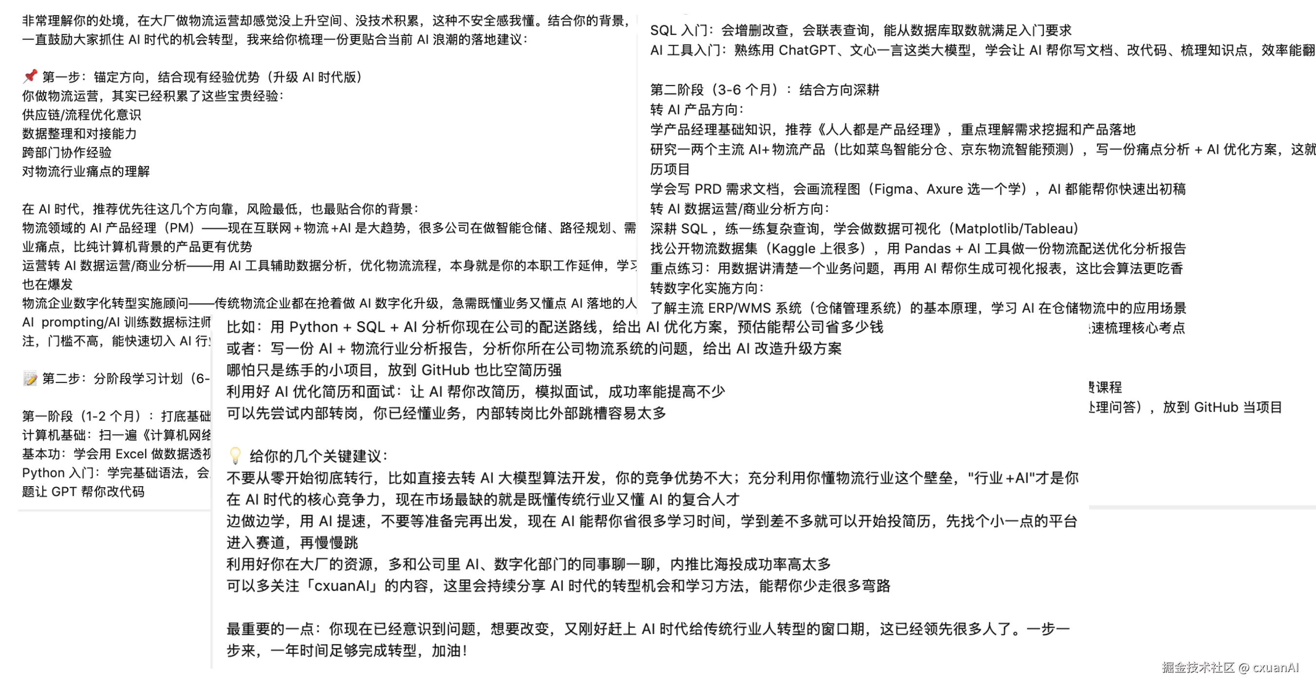 - 转型需要 6-12 个月的心理准备:他现在的焦虑,很大程度来自“想立刻改变”。但实际上,在职转型本身就很难,需要给自己留足时间。哪怕花一年时间慢慢学,只要方向对,都不算慢。