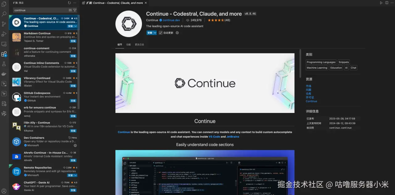 Continue 提供了 VS Code 和 JetBrains 扩展插件,在本文中使用 VS Code。在 VS Code 的扩展商店中安装 Continue:
