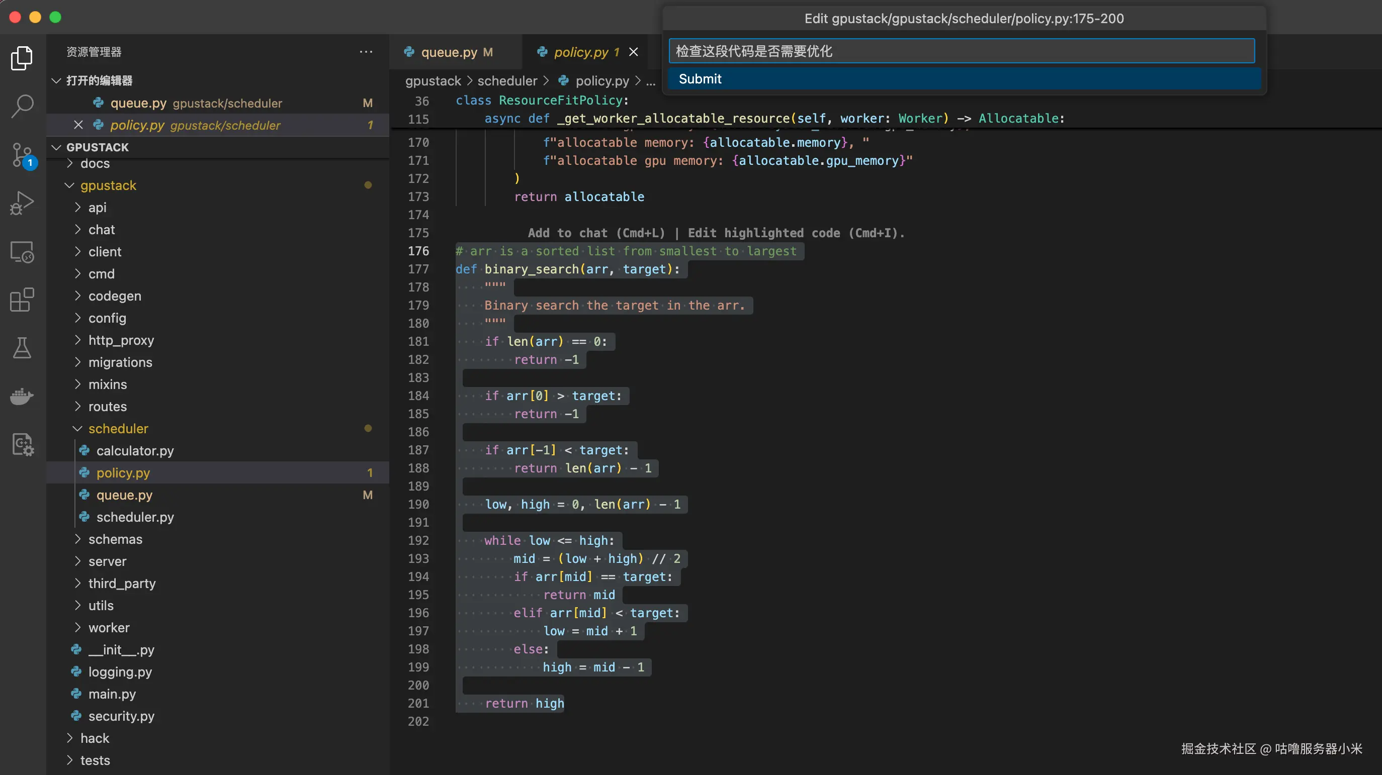 选中代码后,按 Cmd/Ctrl + I ,输入对话,让本地大模型尝试优化代码: