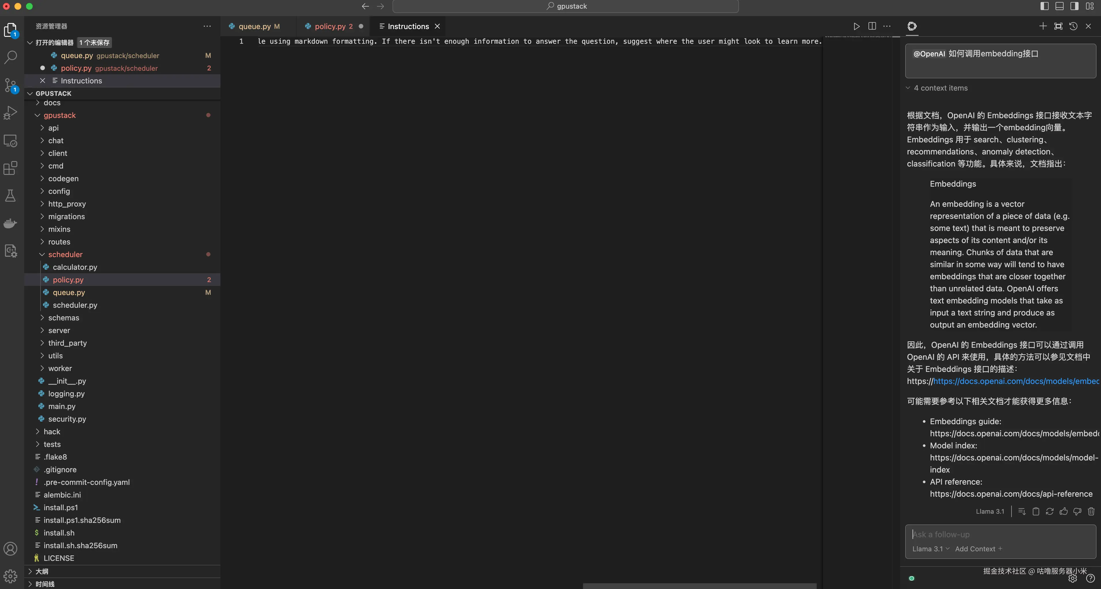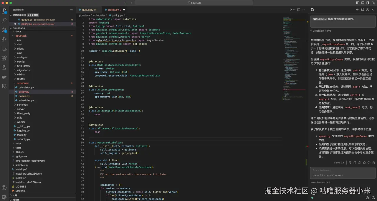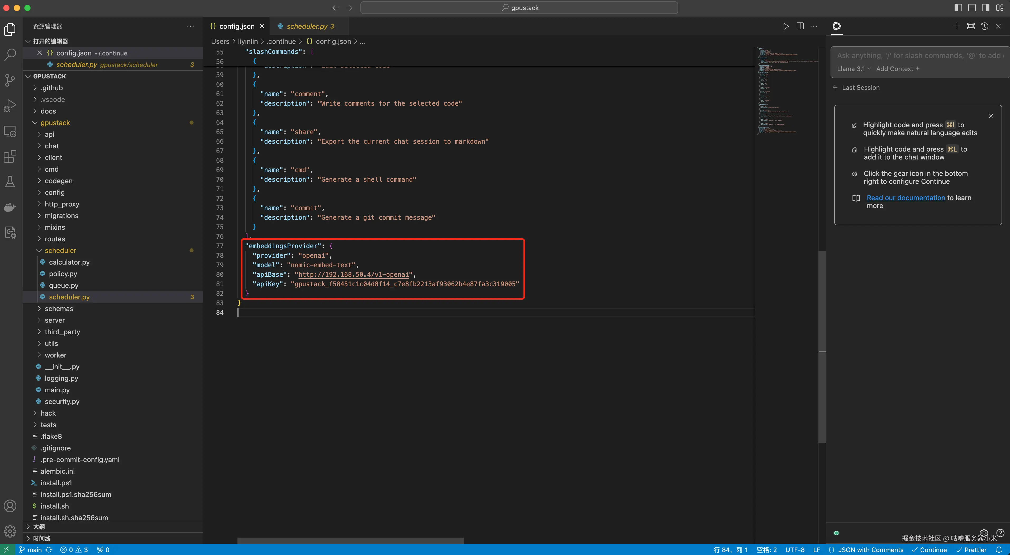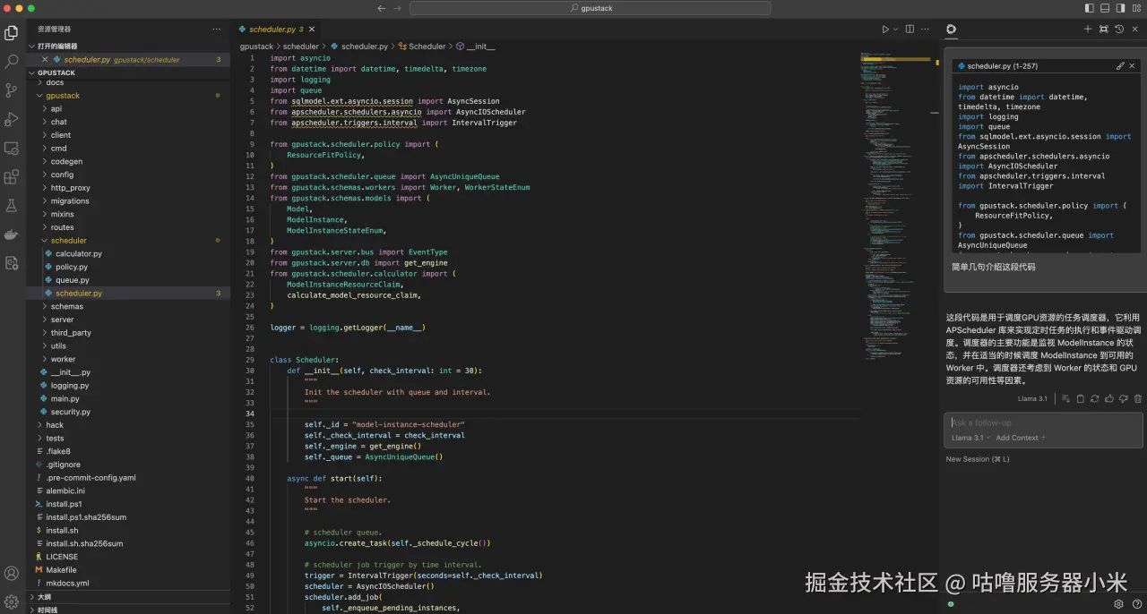 将 Continue 配置好连接 GPUStack 部署的模型后,在右上角 Continue 的插件界面,模型选择前面配置的 Llama 3.1 模型,然后就可以使用前面介绍的功能了。