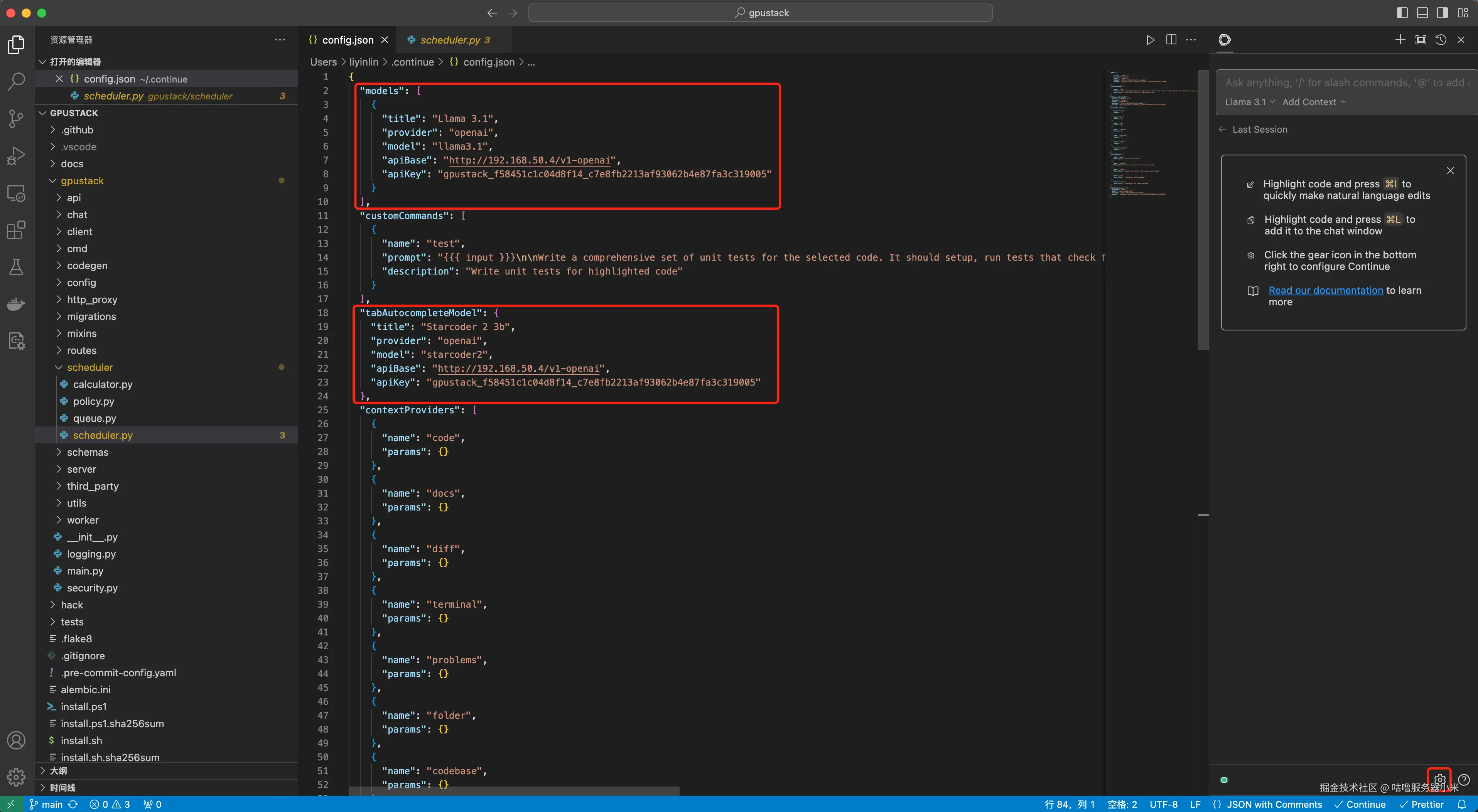 然后选择右下角的设置按钮,编辑 Continue 的配置,连接 GPUStack 部署的模型。