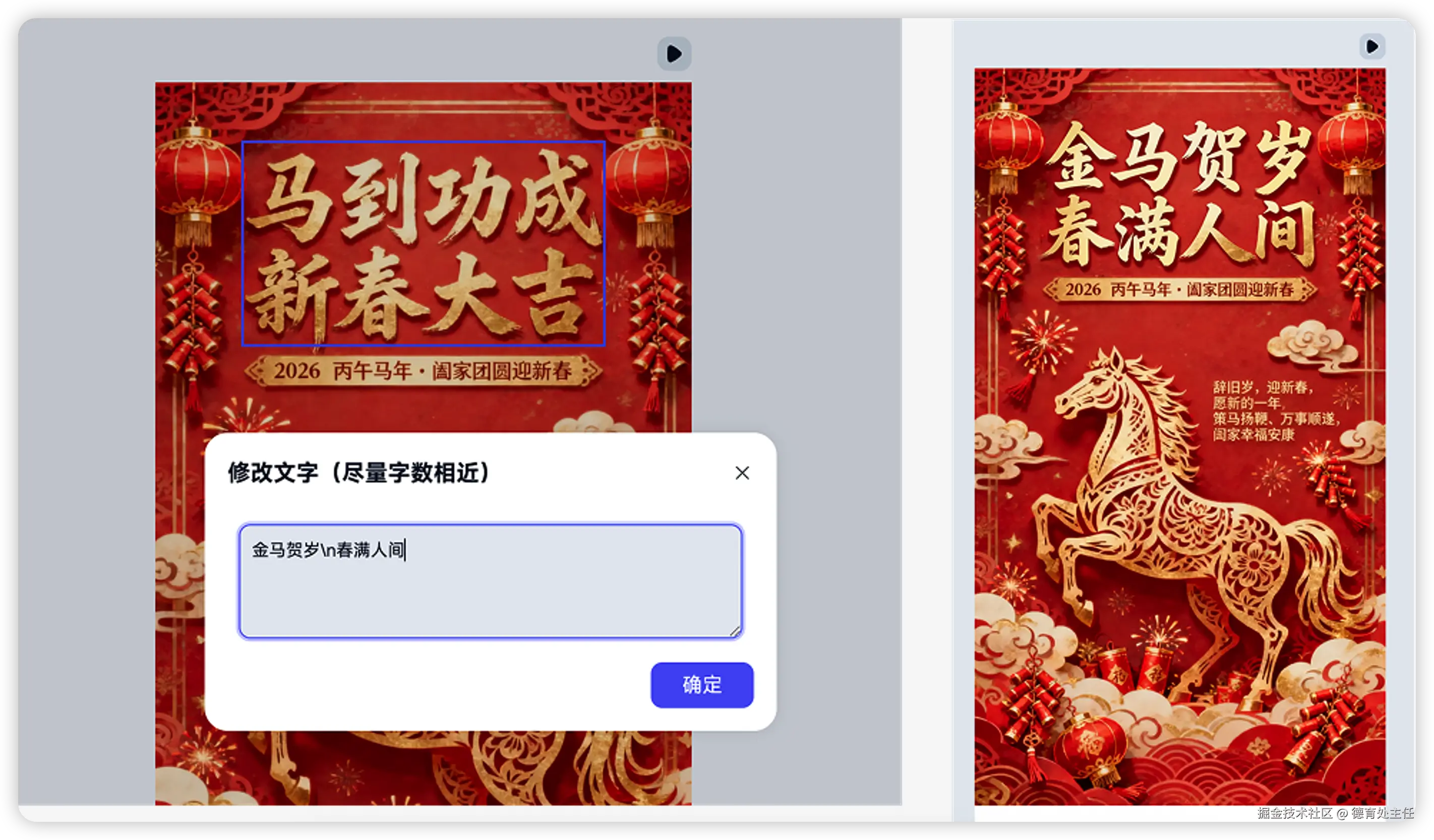 - AI 海报组件的轻量化定制:新增的 AI 海报组件并非简单的生图工具,而是能将生成的海报解析为独立组件(背景、标题、图案、装饰等),支持文字修改、元素替换、组件转换,既能快速生成节日、活动类海报,又能通过组件化编辑实现个性化调整,避免了 “生图即定稿” 的局限。