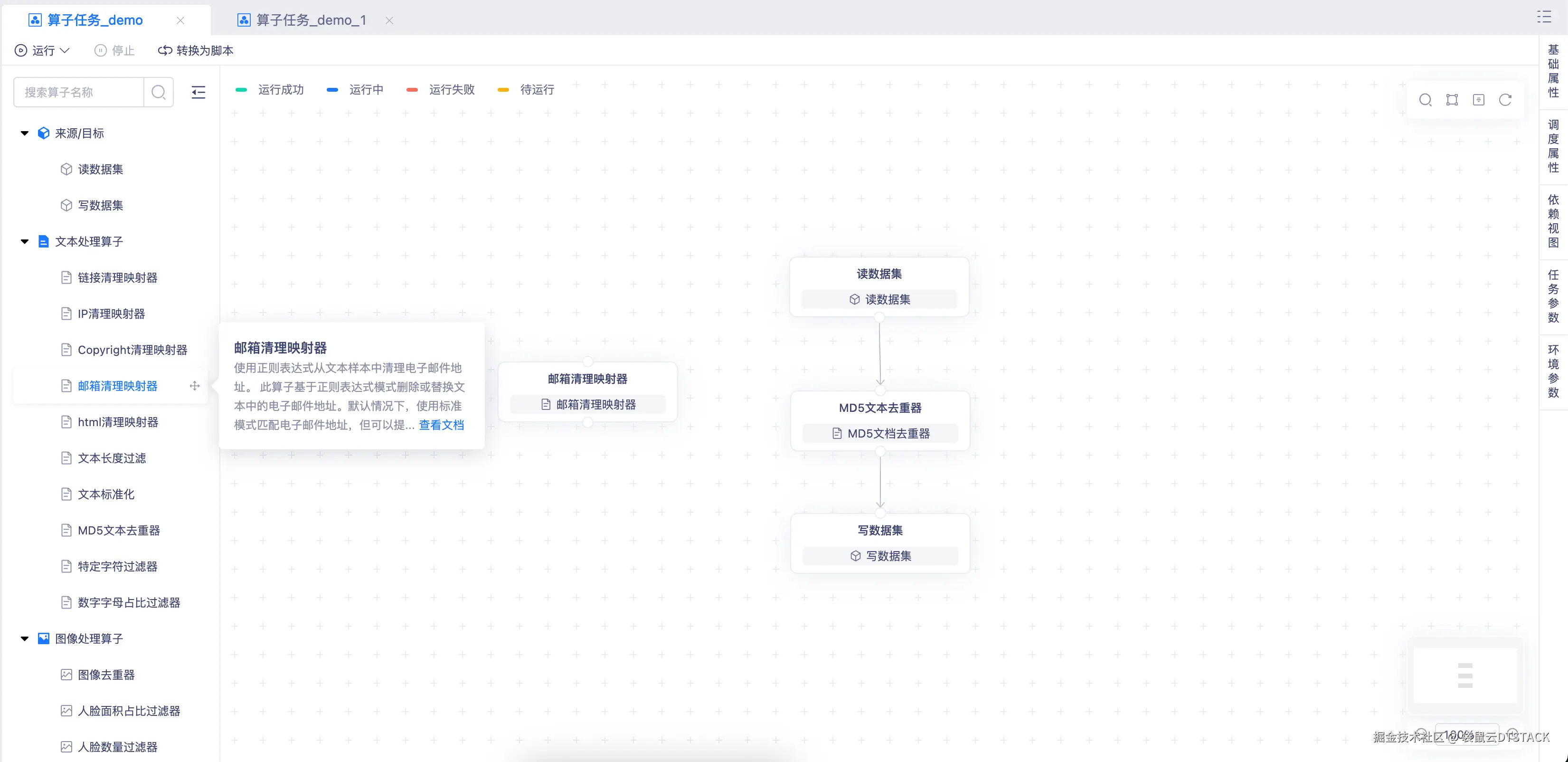 通过拖拉拽的方式构建算子任务的上下游工作流,界面直观、操作简便。即使是非技术背景的运营人员也能轻松上手,大幅降低学习成本,提升工作效率。
