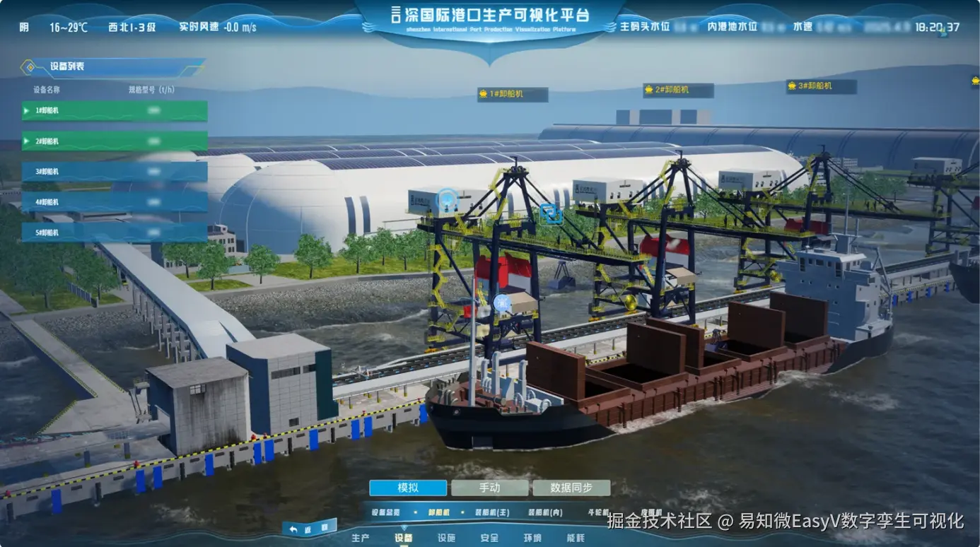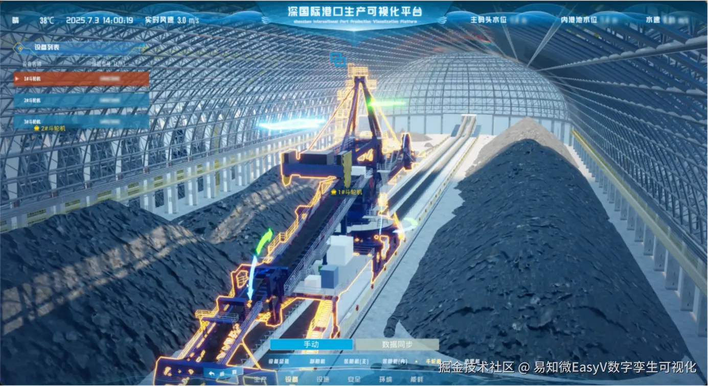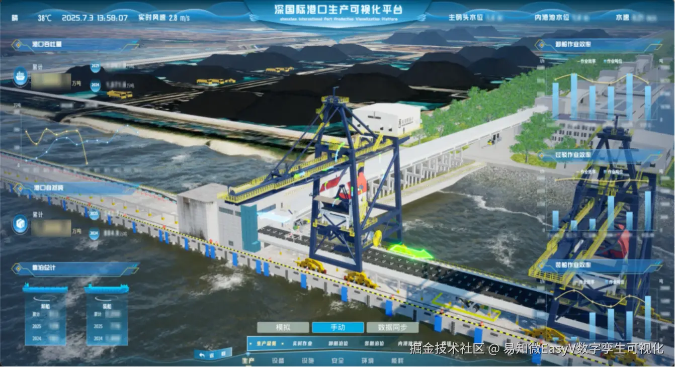 基于三维仿真的孪生底座,构建与实体港口同步的数字空间。融合船舶、堆场、交通、气象及物联网数据,覆盖卸船机、装船机、皮带机、斗轮机等港口关键设备的运行状态和维护情况,打造了高效、安全、智能化的生产管理平台。实现港口运行状态实时呈现、作业进度动态可视、资源分布一体掌控,让管理者能够轻松洞察全局态势。