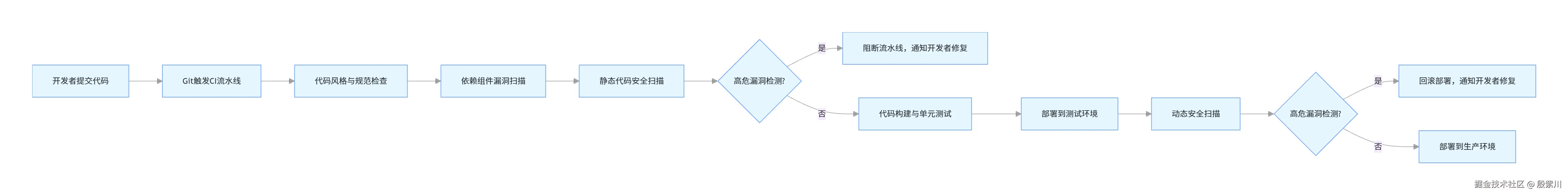 - 全流程覆盖:从代码提交、合并、构建、部署,全流程都必须集成安全扫描,确保每个环节都有安全校验。