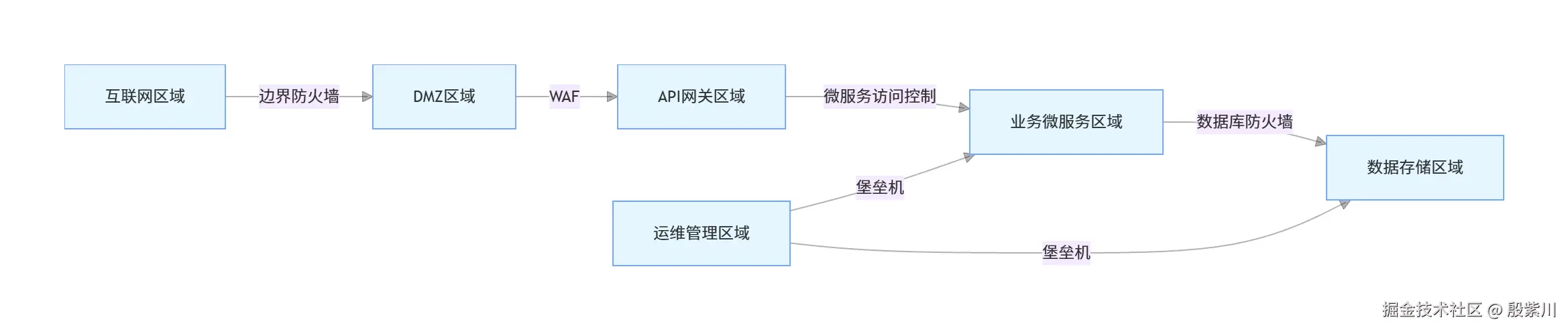 - 安全区域边界:是否明确划分安全区域、实现最小权限ACL规则、API网关攻击防护、服务间访问控制
