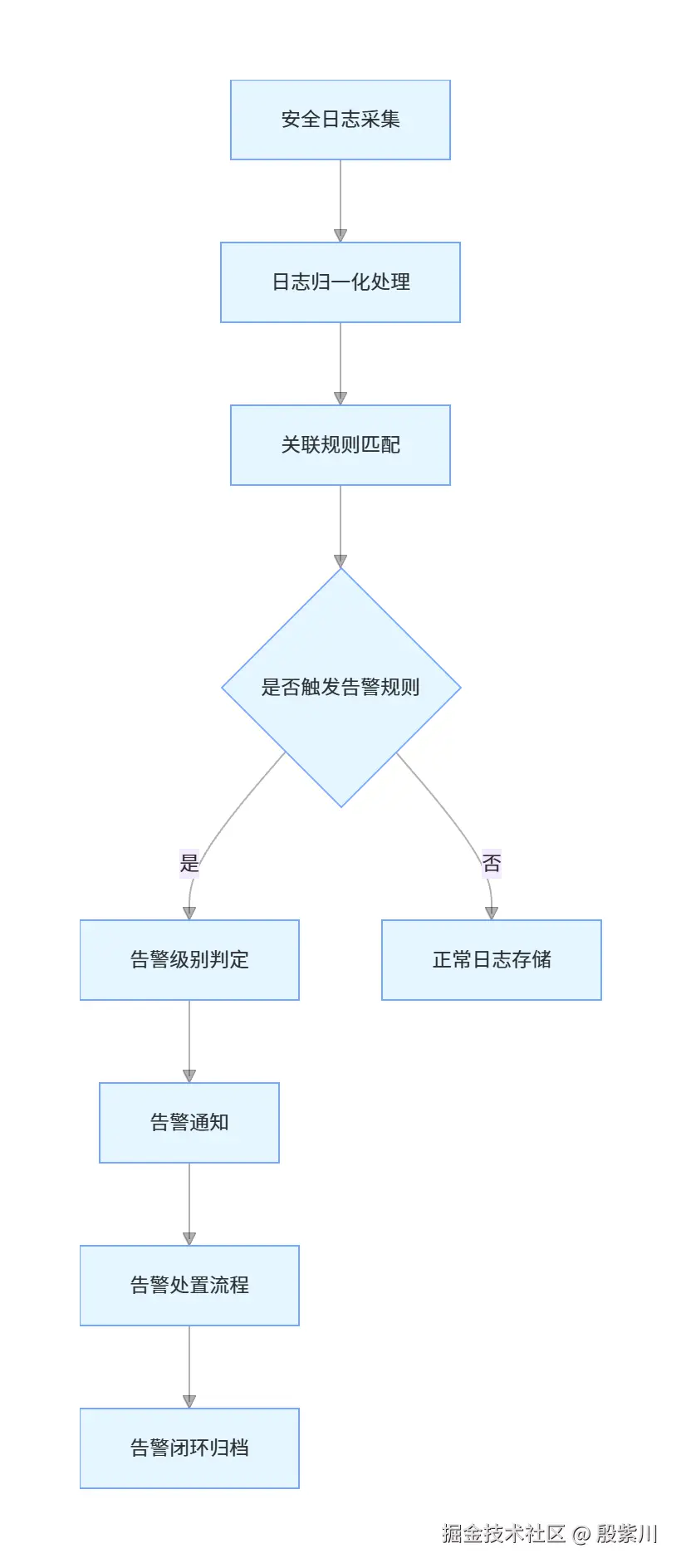 - 安全事件统一监控:采用SIEM系统实现全系统安全日志的统一收集、关联分析,对异常登录、越权访问、SQL注入、暴力破解等安全事件进行实时告警,告警流程如下: