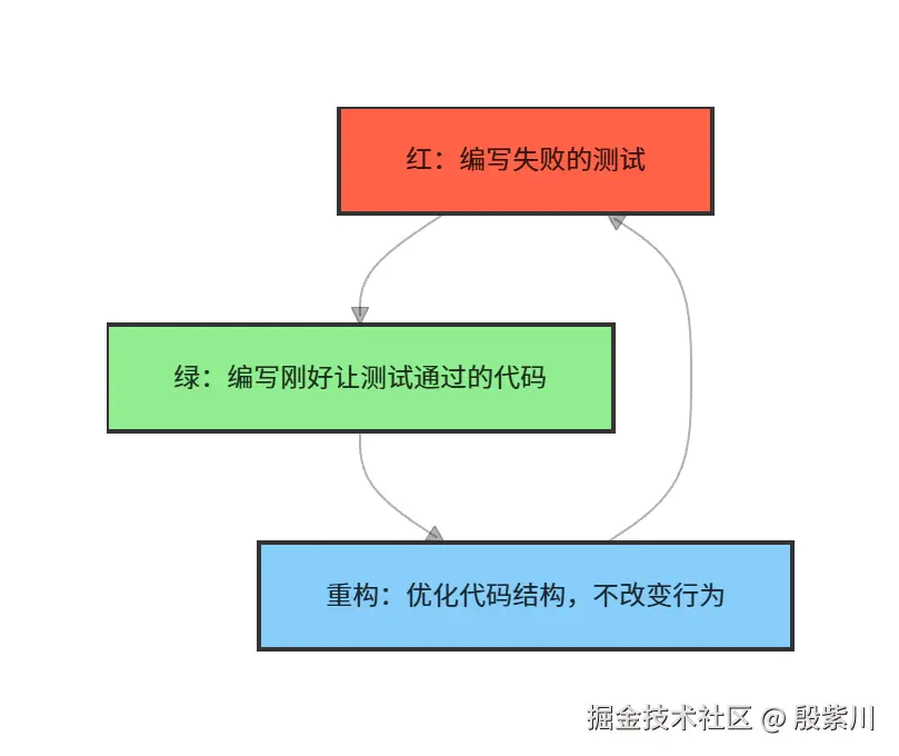 TDD的整个过程,由三个步骤组成一个无限循环,每个步骤都有明确的目标和要求,不能跳过任何一步。