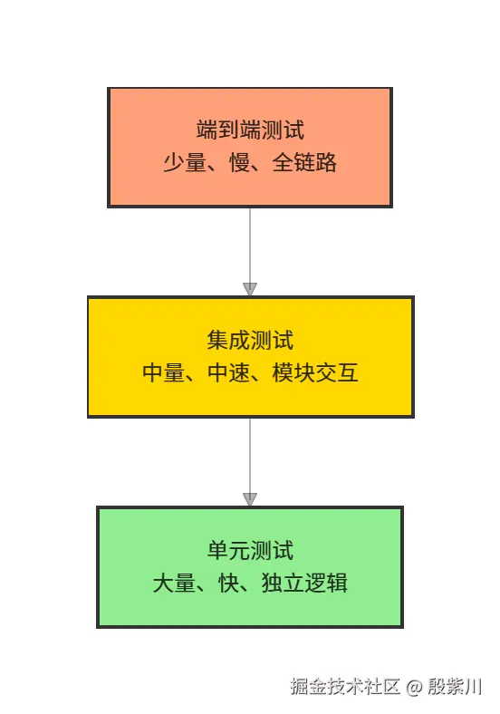 - 顶层端到端测试:聚焦完整业务链路的全流程验证,从用户入口到数据存储全链路覆盖,执行速度最慢,数量最少。