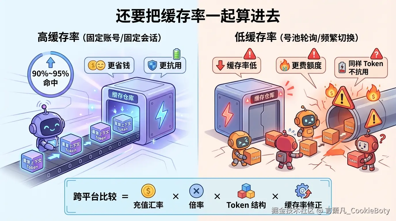 比较价格,不能只看“¥多少 = $1” 或倍率数字,还要看这个平台能不能把你的高重复上下文真正缓存住。