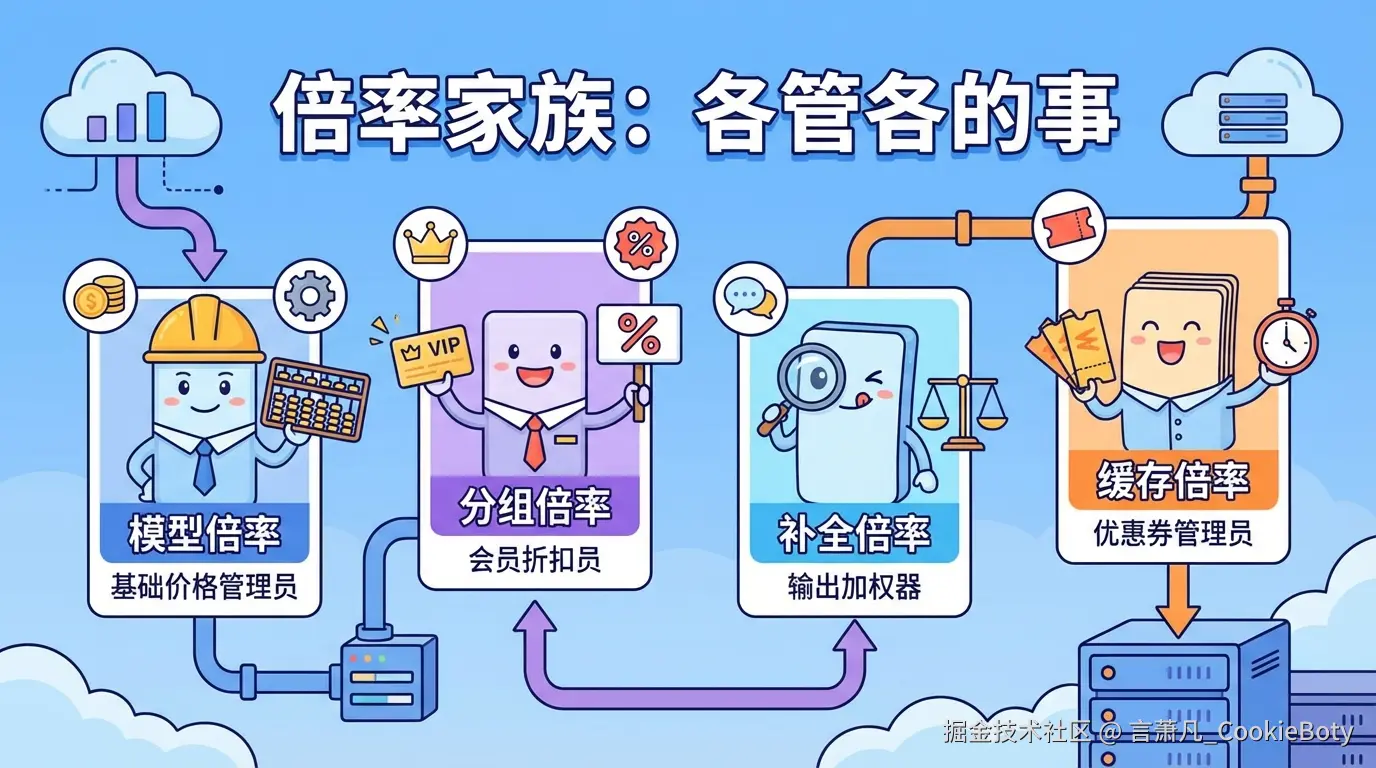 官方计费看的是 Token 结构——输入、缓存输入、输出,以及 thinking 带来的额外 Token;中转站做的,则是在这套结构之上,再叠加模型倍率、补全倍率、分组倍率和缓存倍率,把官方成本映射成自己的余额与配额规则。