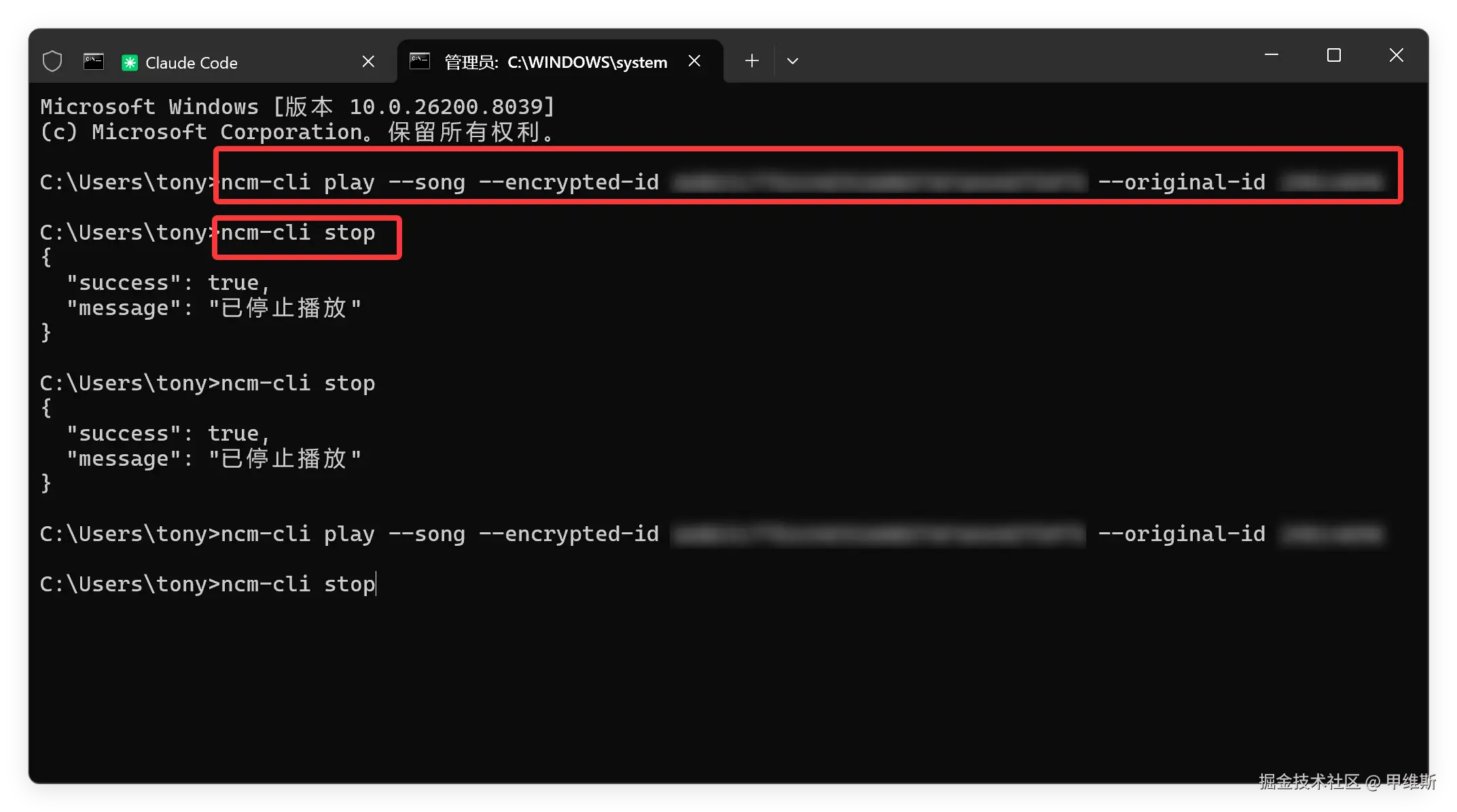 ncm-cli play --song --encrypted-id 加密 ID --original-id 原始 ID