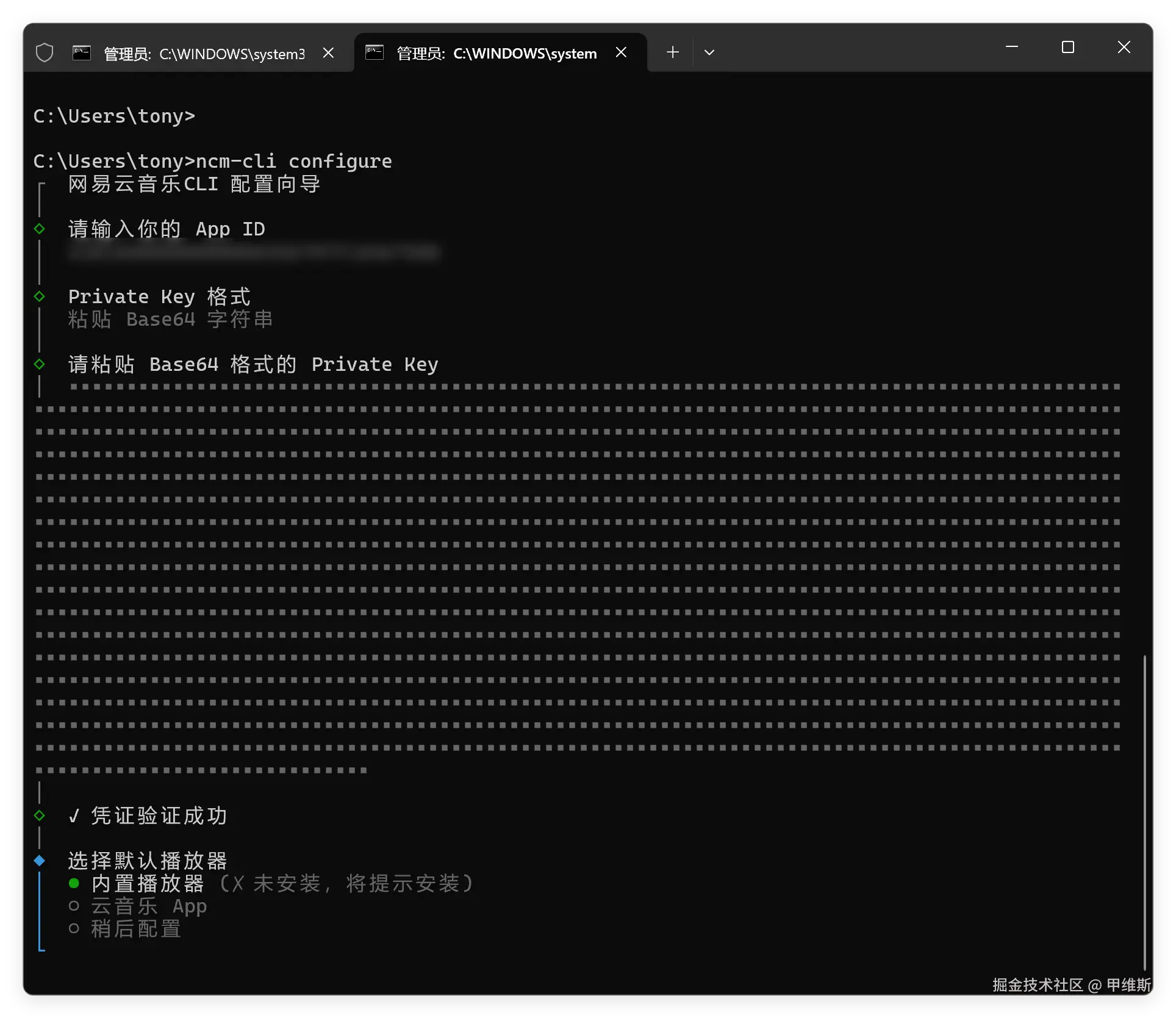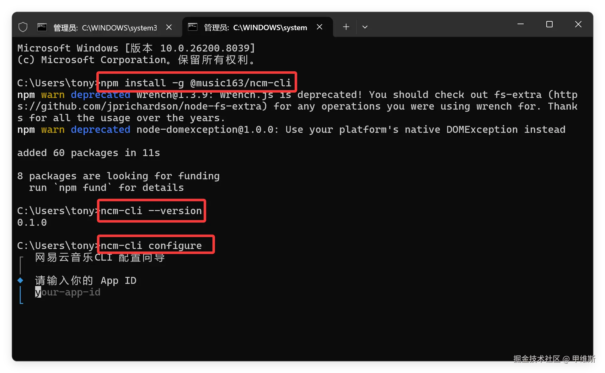 第一个安装它的 CLI 工具。第二个配置网易云的 API。