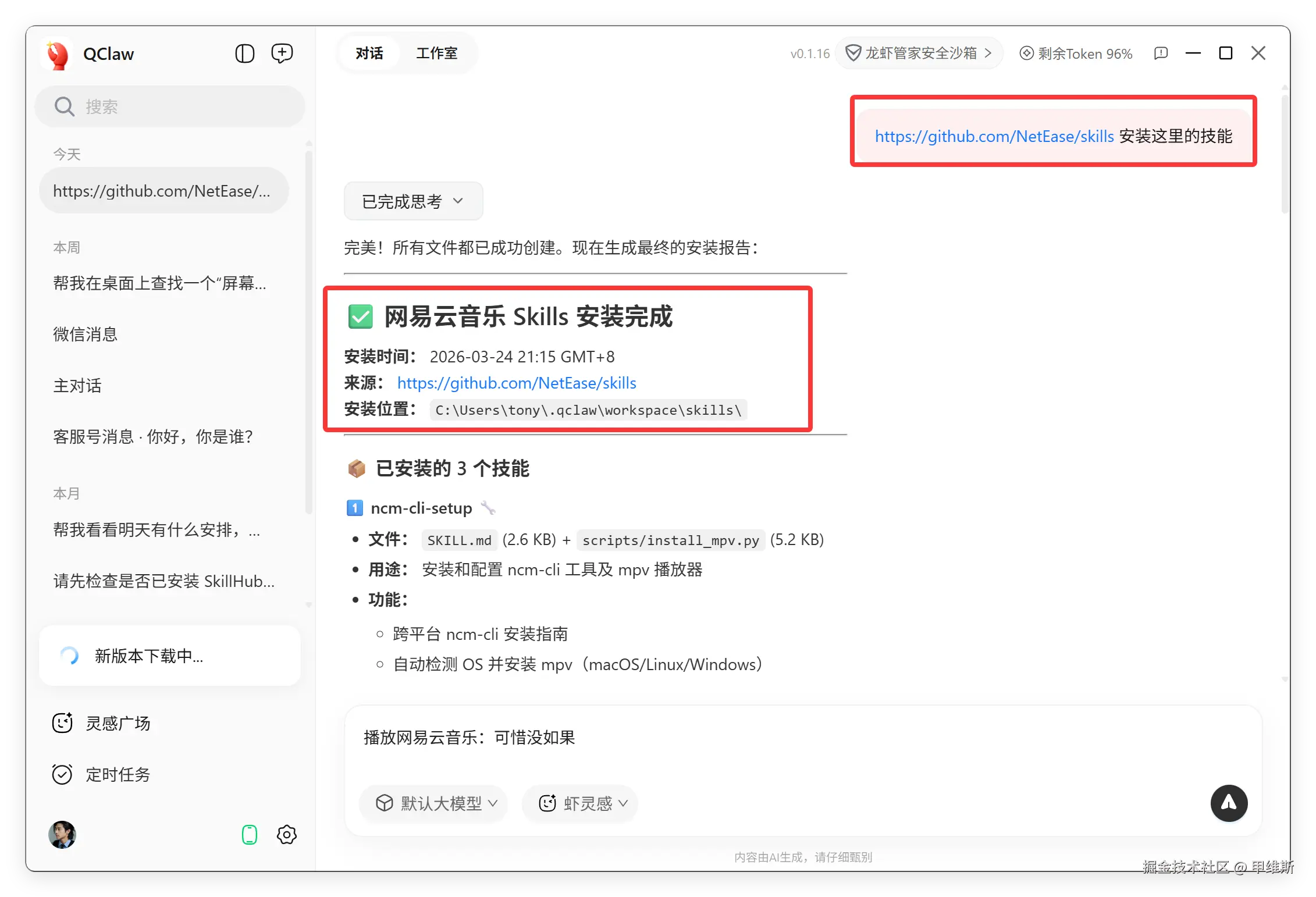 原理就是把网易云技能拷贝到~/.openclaw/skills/