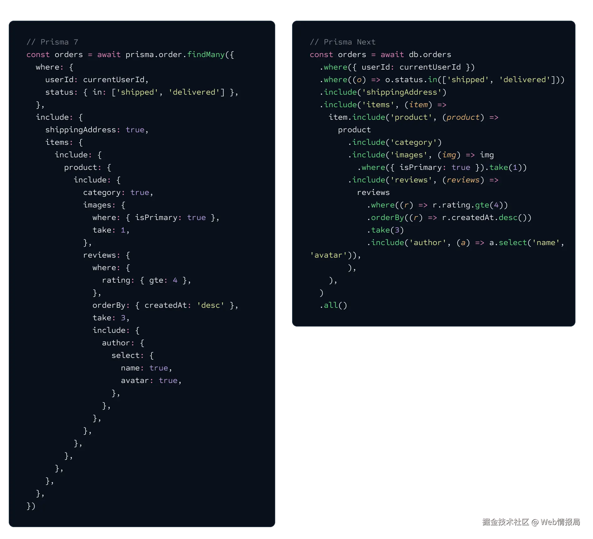 还有,Prisma Next 会把“查询地狱“重整为更优雅可读的链式调用。