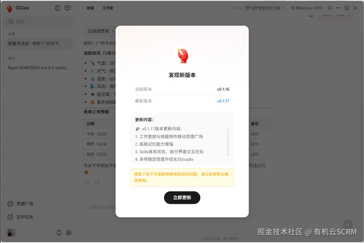 打开 QClaw 客户端,点击弹窗「立即更新」,完成 v0.1.17 安装。