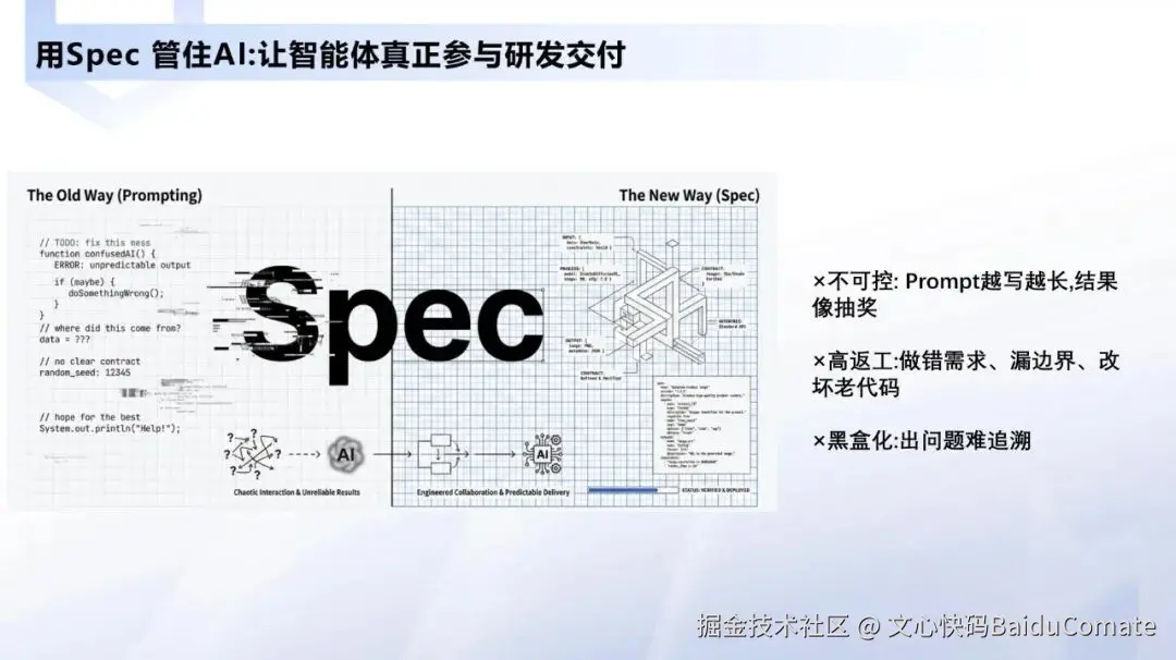 | 常见风险 | 上下文越聊越长、模型惯性、越改越偏、过度“体感” | 文档成本高、前期慢;如果 Doc 写“空/错”,会“一步错步步错” |