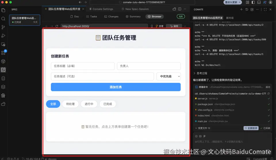 如果任务涉及前端页面开发,用户可以在Browser Tab中直接查看运行后的页面效果,方便快速验证功能是否符合预期。