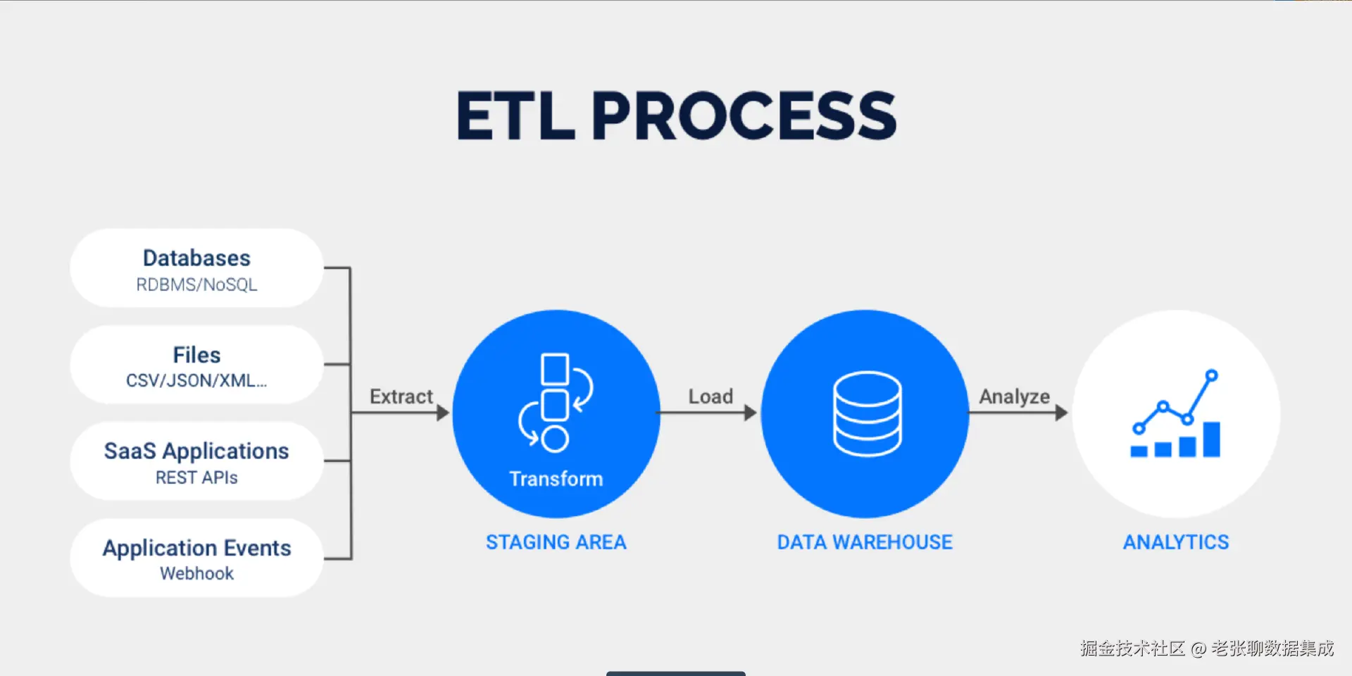 ETL是最早出现的,也是很多传统企业至今还在使用的数据处理方式。ETL三个字母分别对应Extract(提取)、Transform(转换)、Load(加载),这三个步骤就是它的核心流程。