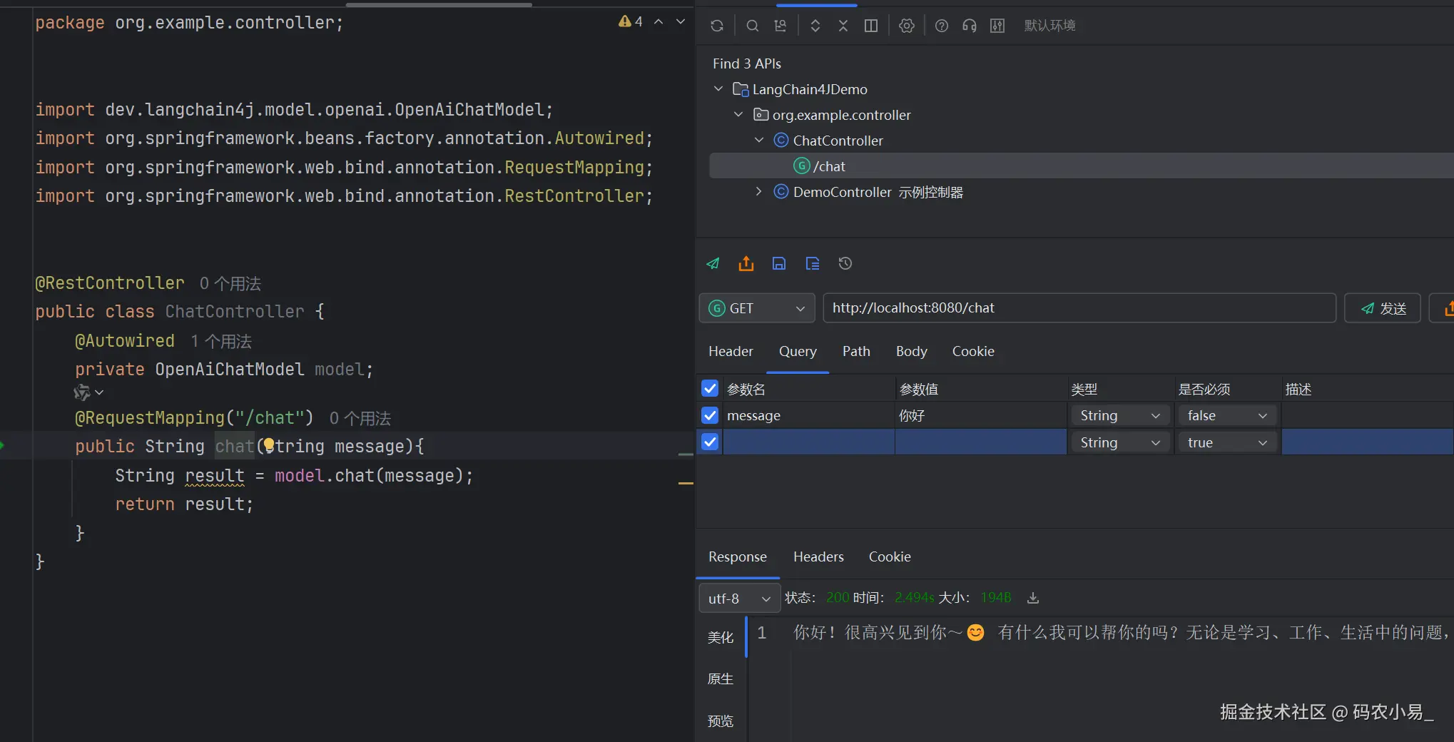 LangChain4J 提供了 AiServices 工具类,封装了 model 对象和其他功能,用起来非常简单。