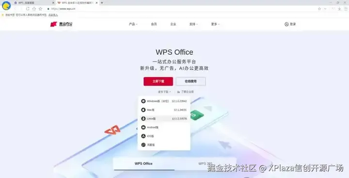 在 WPS 官网找到【更多下载】-【Linux版】,下载【64位 Deb格式】。