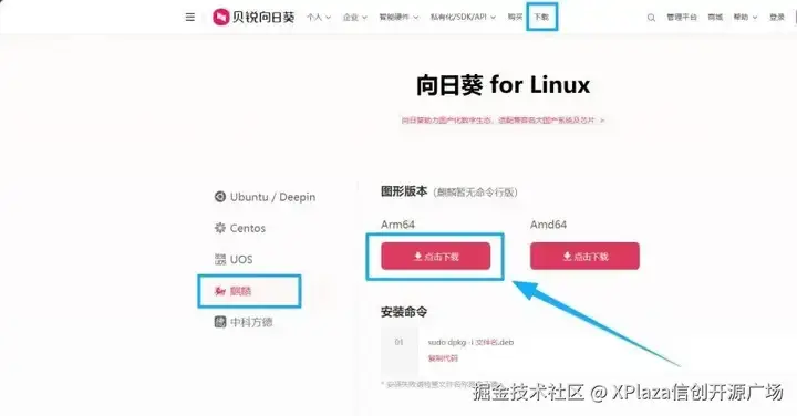 由于我使用的电脑 CPU 为飞腾系列的 FT2000/4 ,安装包要选择【ARM版本】的【 .deb】格式下载。