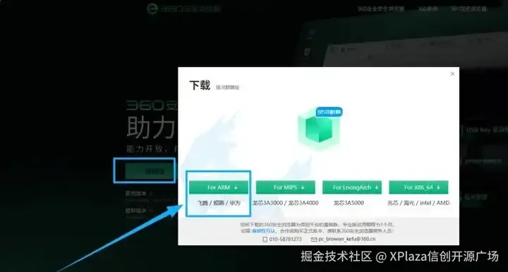 进入360安全浏览器官网,点击上方的【全部浏览器产品】,点击【信创版】,选择【麒麟版】中的【For ARM】版本下载。