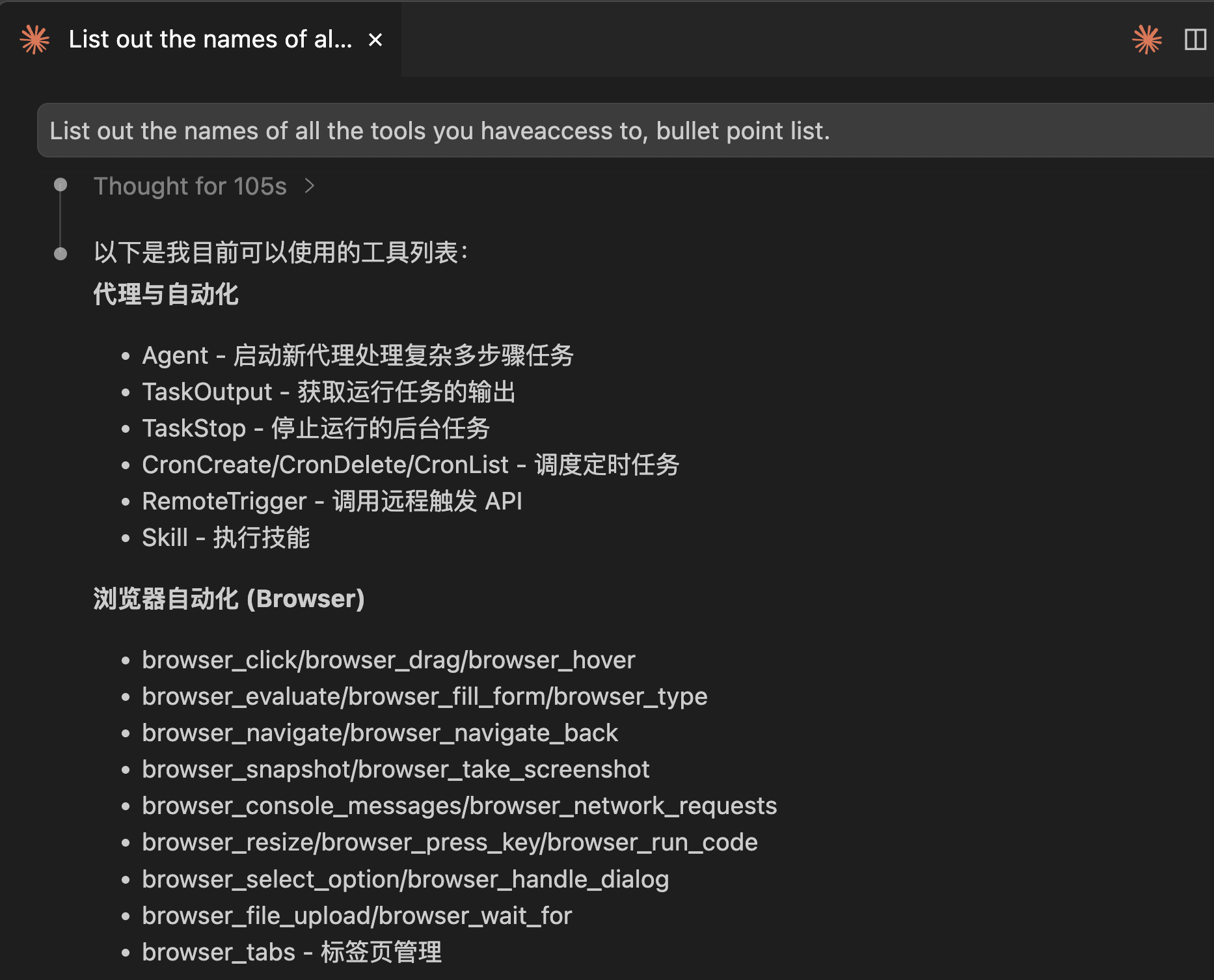 想看当前环境有哪些工具,直接询问 Claude 获取列表。特别是添加自定义 MCP 服务器后,这点尤为有用,因为可用工具可能变化。