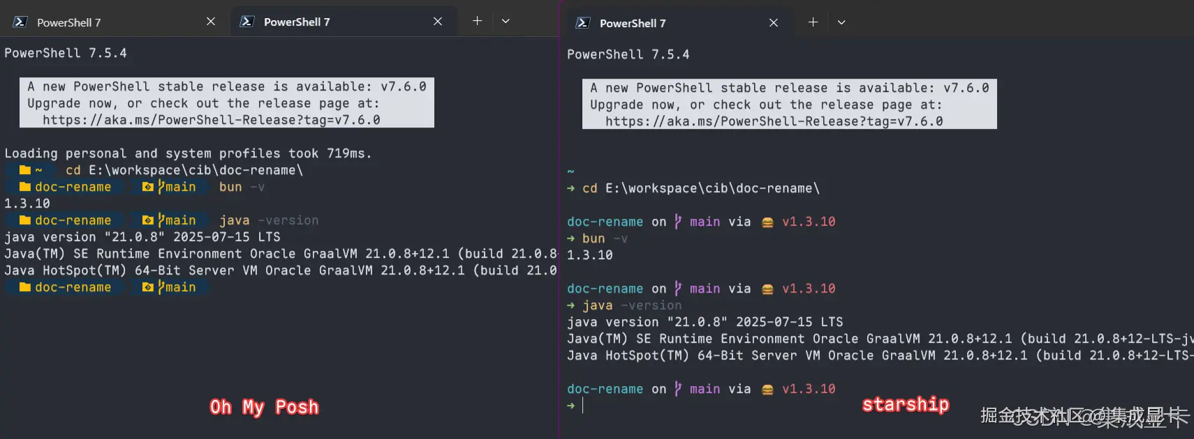 先看看两个提示符运行时的对比图,oh-my-posh 其实更简洁些,因为 starship 默认是在次行输入命令并且自动添加新行。