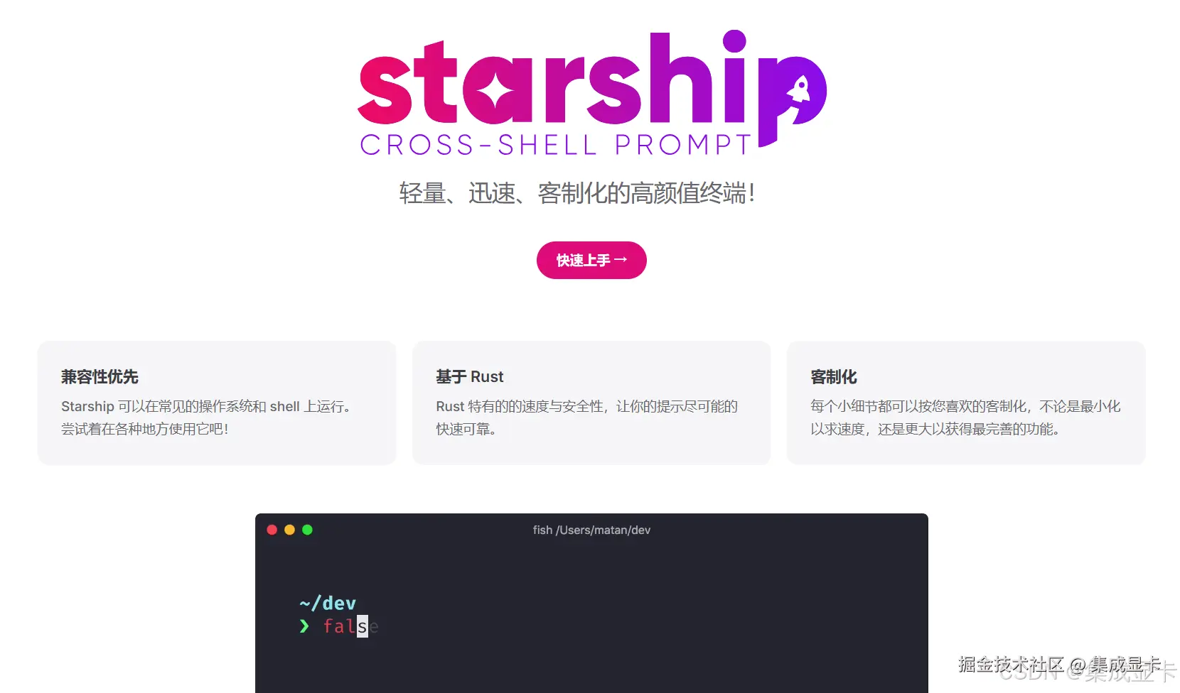 Starship 是一个用 Rust 编写的跨 Shell 提示符工具,官方宣称:适用于任何 shell 的极简、超快且无限可定制的提示符!