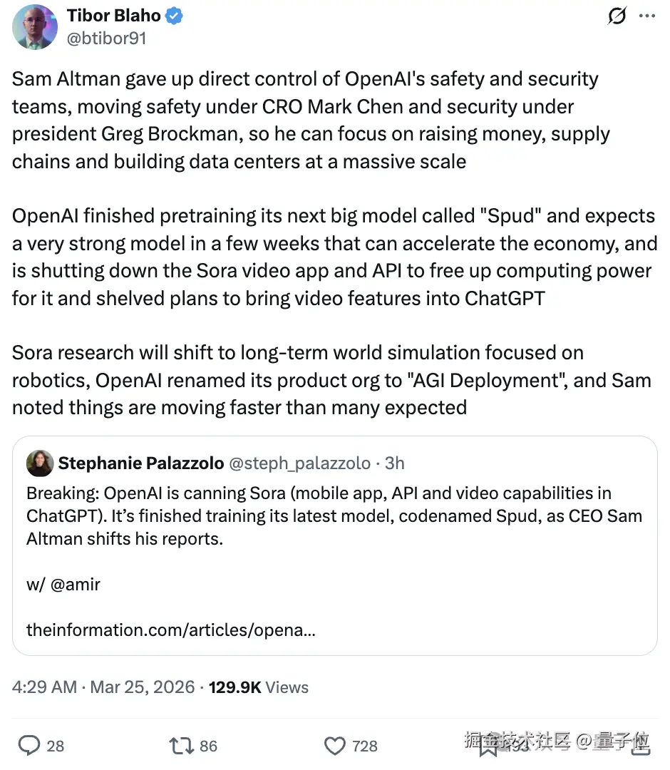 OpenAI 已完成其下一代大型模型 “Spud” 的预训练,预计在几周内推出一款性能很强的模型。正是为了为这款新模型腾出算力资源,OpenAI 决定关停 Sora,同时搁置将视频功能接入 ChatGPT 的相关计划。