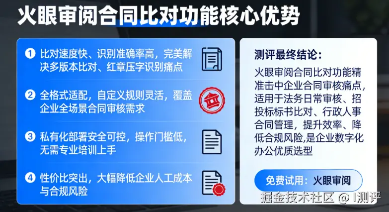 整体来看,火眼审阅的合同比对功能,是一款精准击中企业合同审核痛点的效率工具,无论是法务日常合同审核、招投标标书比对,还是行政人事合同管理,都能大幅提升工作效率、降低合规风险,是企业数字化办公的优质选型。